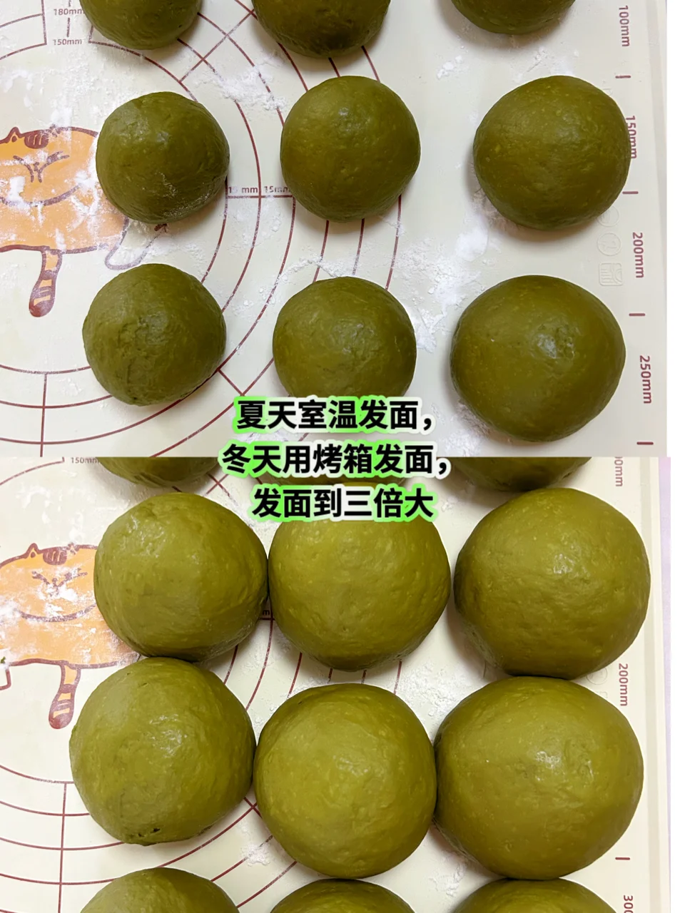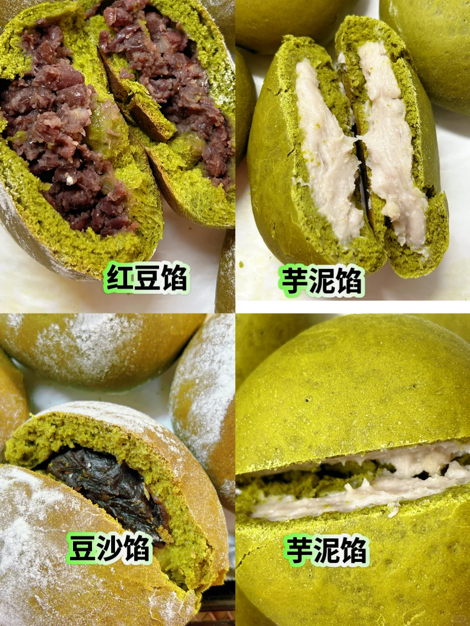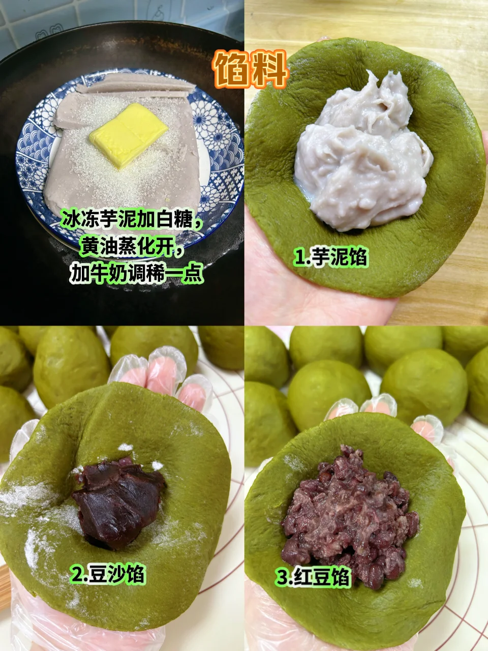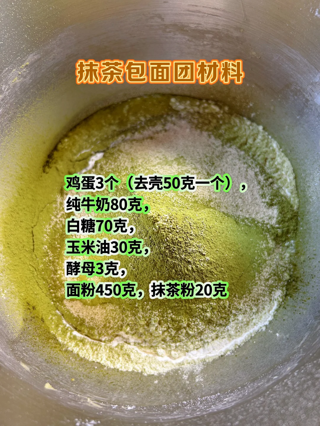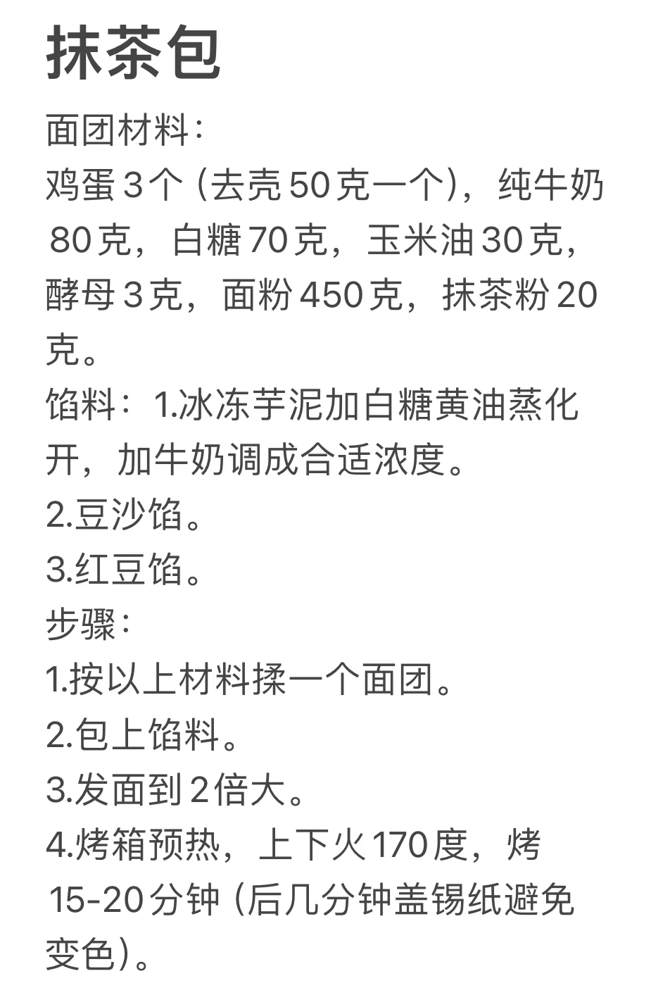 抹茶面包面团材料: 鸡蛋3个(去壳50克一个),纯牛奶80克,白糖70克,玉米油30克,酵母3克,面粉450克,抹茶粉20克。 馅料:1.冰冻芋泥加白糖黄油蒸化开,加牛奶调成合适浓度。 2.豆沙馅。 3.红豆馅。 步骤: 1.按以上材料揉一个面团。 2.包上馅料。 3.发面到2倍大。 4.烤箱预热,上下火170度,烤15-20分钟(后几分钟盖锡纸避免变色)。