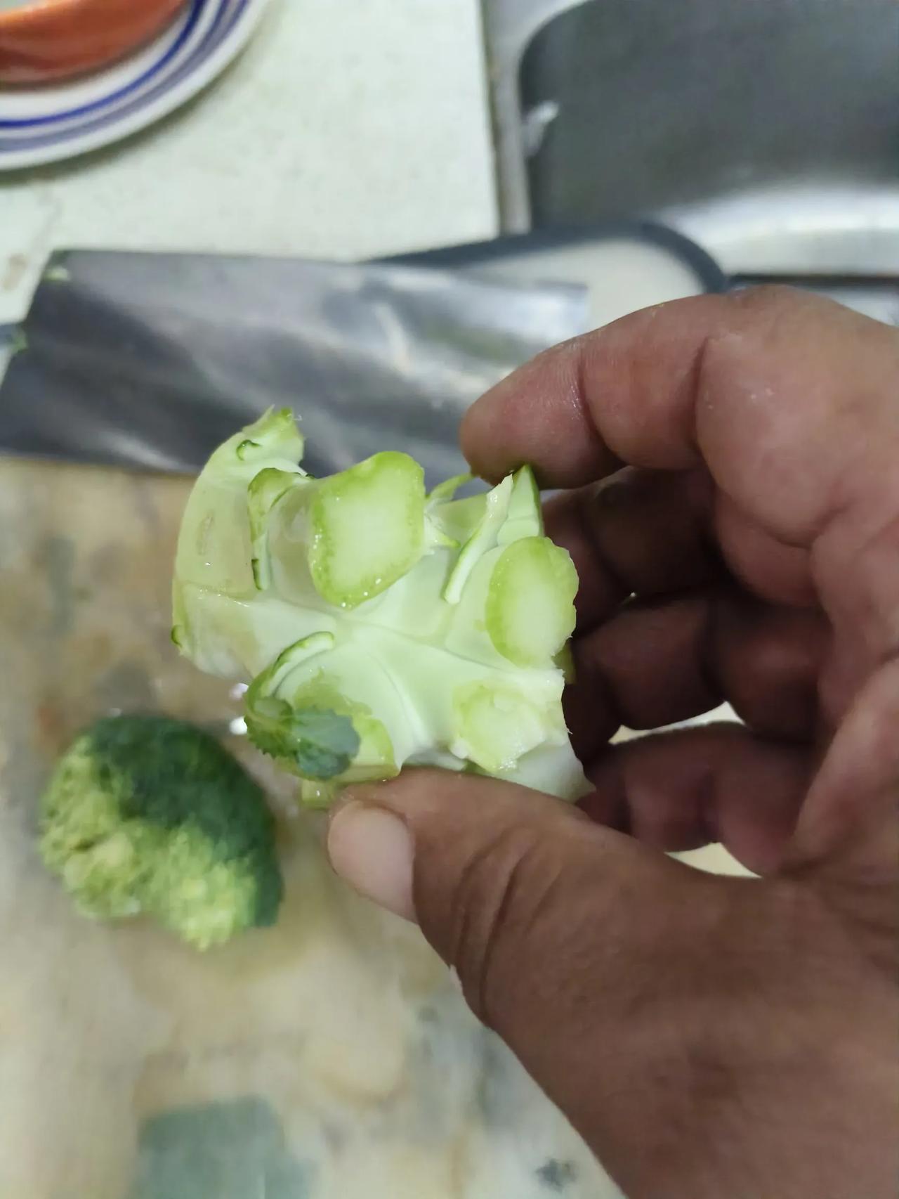 西蓝花这个蔬菜,光这个梗就占了这么大的比例,丢了吧浪费,炒着吃又发硬,而且别的部分熟了,这个部分还发生。 还有菜花也这样,这两种蔬菜很是奇葩。