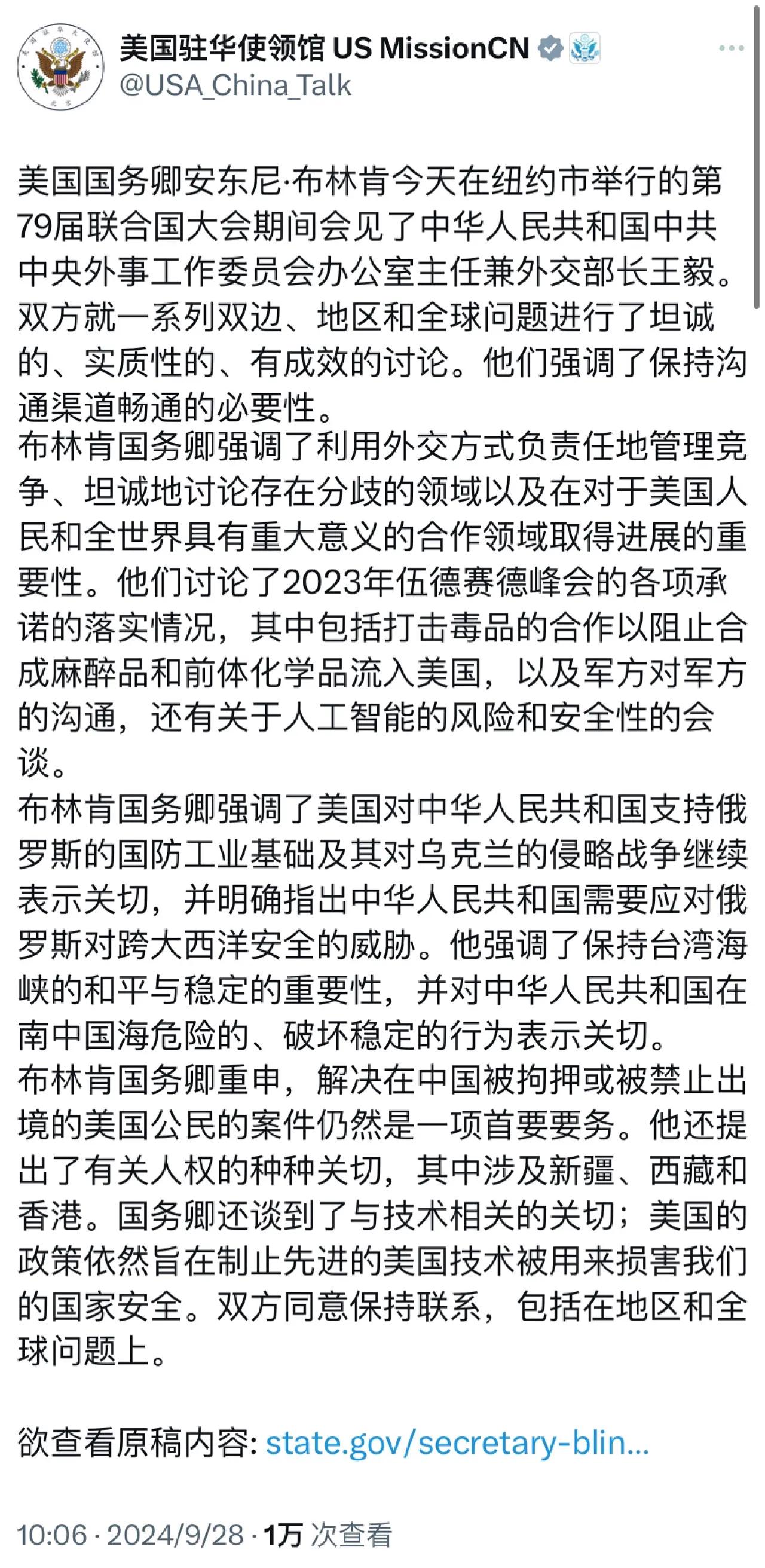 王毅外长与美国国务卿布林肯在纽约举行会晤,对比中美两国发布的通稿,中美分歧依旧很大,但是双方都强调了保持沟通渠道畅通的重要性。。 王毅外长直接正告美方,美方不能总是以“两副面孔”对华,一边肆无忌惮围堵打压中国,一边若无其事同中国对话合作。中方重点关注了台海局势、美方对华经贸科技打压、南海问题,以及乌克兰问题。 布林肯则对所谓的“中华人民共和国支持俄罗斯的国防工业及其对乌克兰的侵略表示关切”,并强调“维护台湾海峡和平稳定以及反对中国在南海破坏稳定行为的重要性”。此外,布林肯又老调重弹,提到了所谓的新疆、西藏和香港的人权问题。 [机智]双方通稿还有一个最大特点,就是强调自己说了什么,但是对于对方说了什么,没有太多提及。