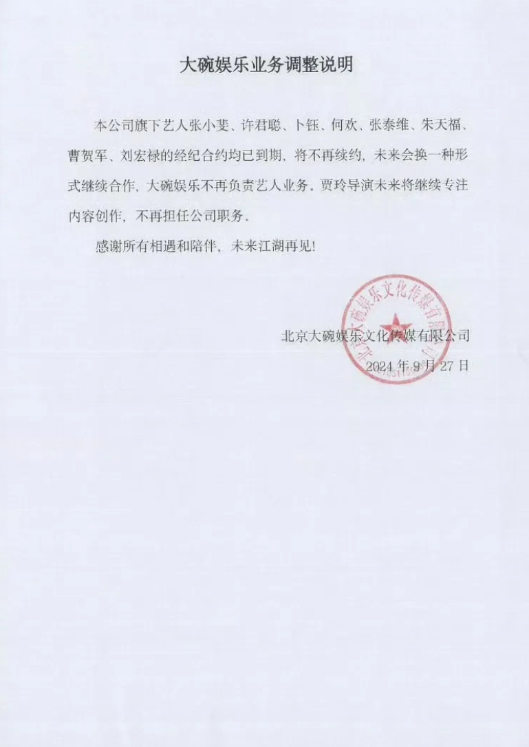 大碗娱乐所有艺人离职,贾玲和张小斐这对姐妹花分开了。 今天宣布所有艺人合约到期不续约,张小斐,许君聪,何欢,有名字的不续约了。