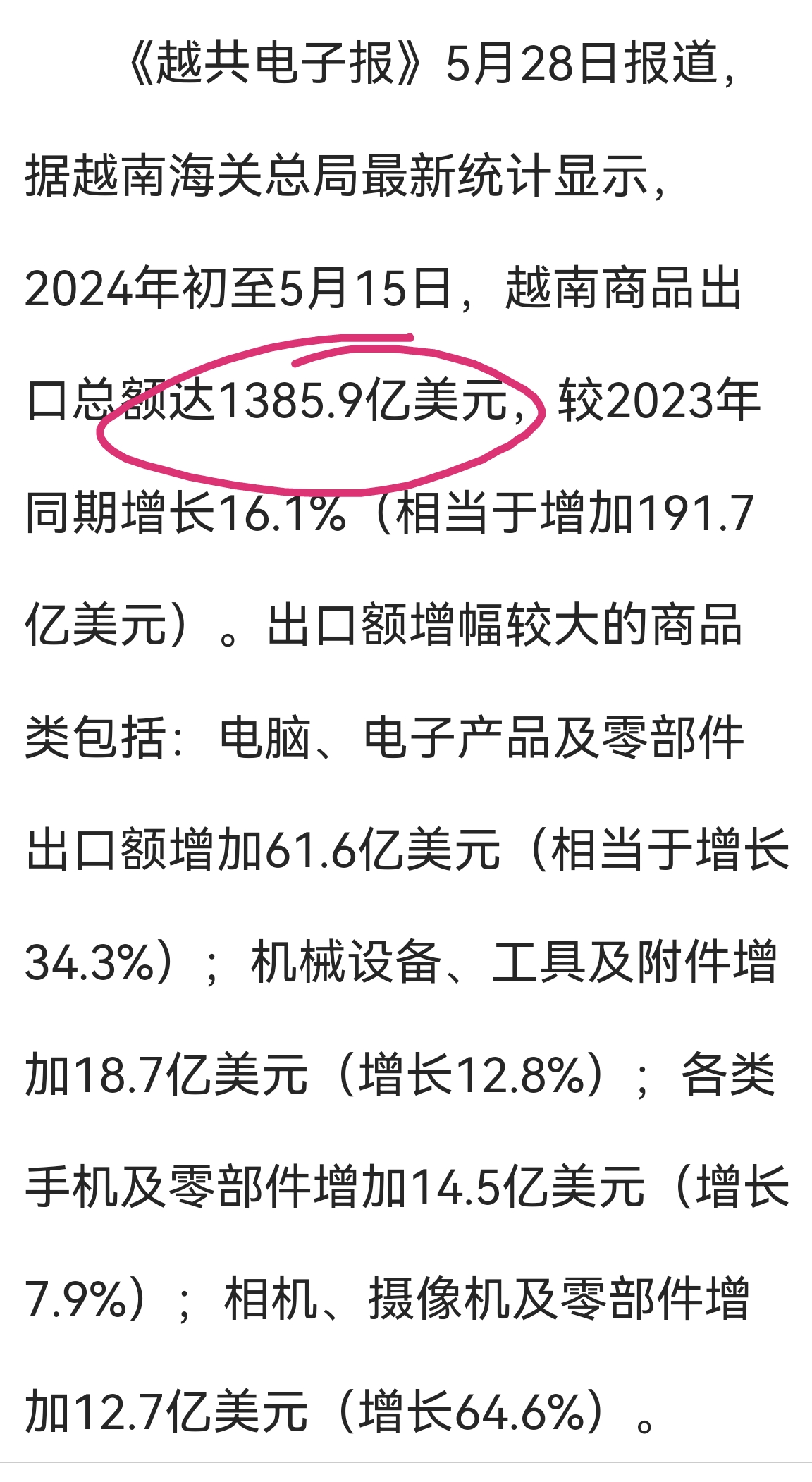 2024年初至5月15日,越南商品出口总额达1385.9亿美元,与吹的1627亿美元,怎么别的行业还亏了200多亿美元呢?
