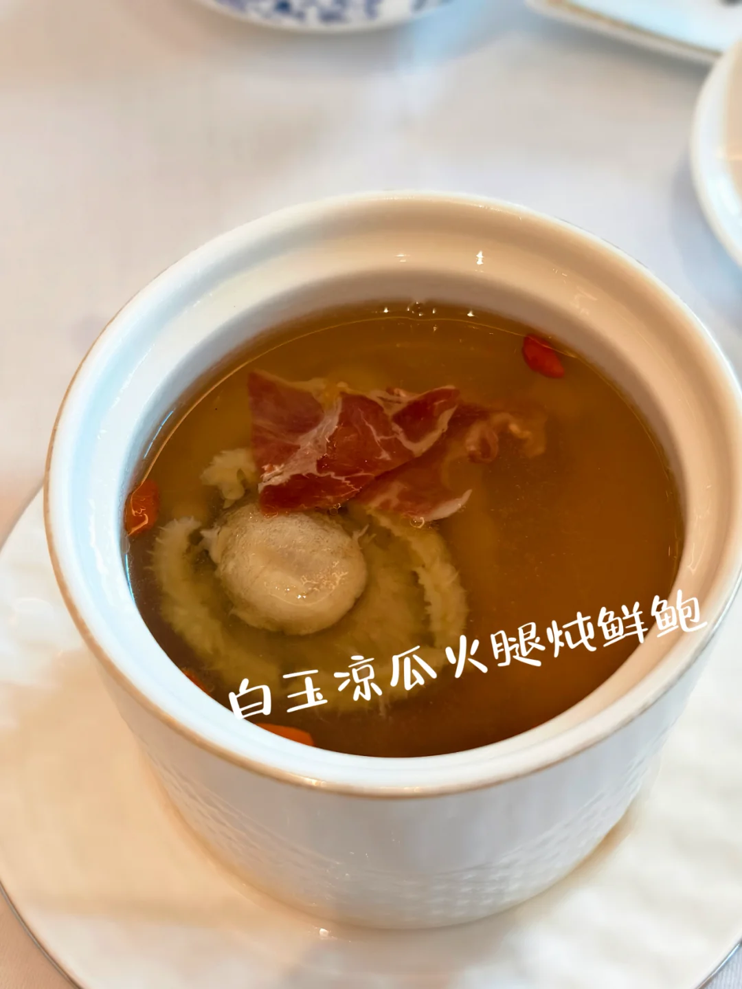 白玉凉瓜火腿炖鲜鲍,汤是鲜的,所谓凉瓜就是苦瓜,还真的有点苦的。