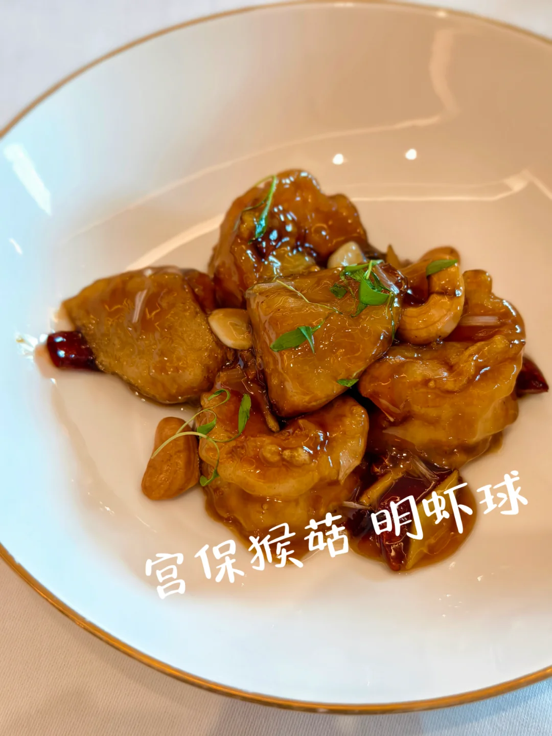 宫保猴菇明虾球:明虾 Q 弹紧实,给的量也很有诚意,足足三颗虾球。