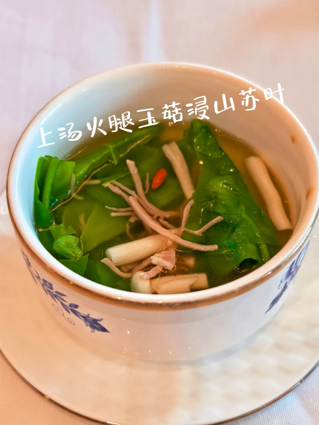 上汤火腿玉菇浸山苏叶:感觉也是个汤品,有点重复了。