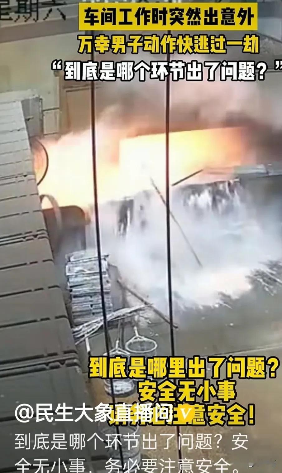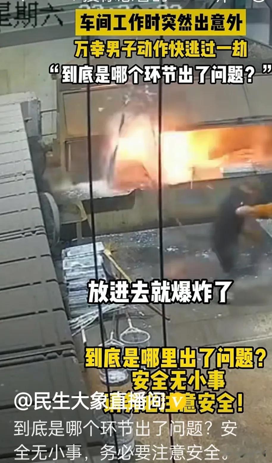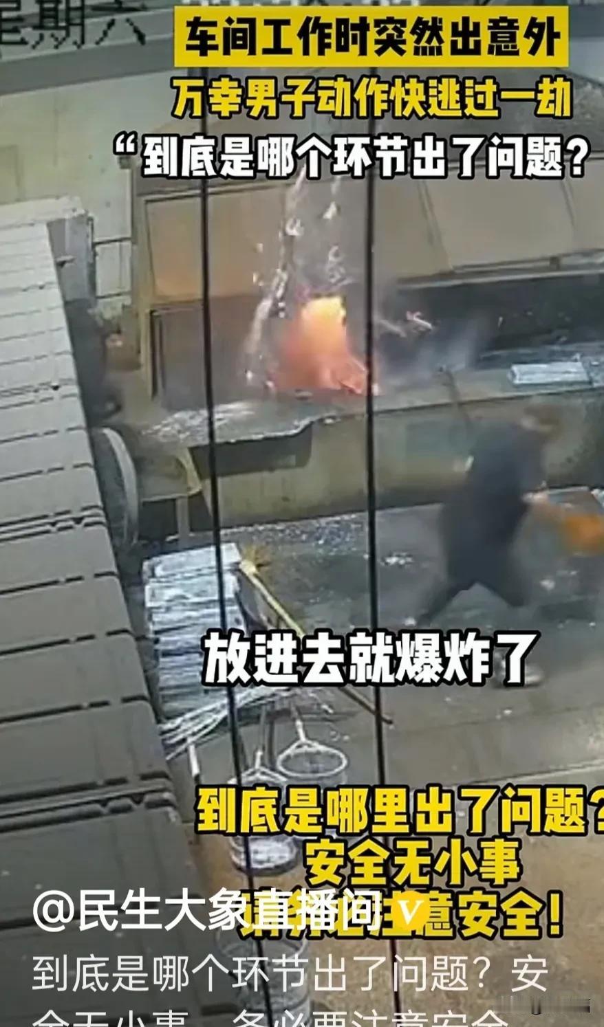 浙江杭州一车间发生意外,这工人幸好闪得快啊!这高温铝水可不是闹着玩的。安全无小事,任何一个细小的环节都“马户”不得,只有驴会做出这种愚蠢的事来,典型的违规操作。 有网友很专业的回答了一下:工具潮湿或沾水了,不能直接进铝水,放边上烘热一下。因大量高温铝水遇到冷却水瞬间气化产生爆炸。
