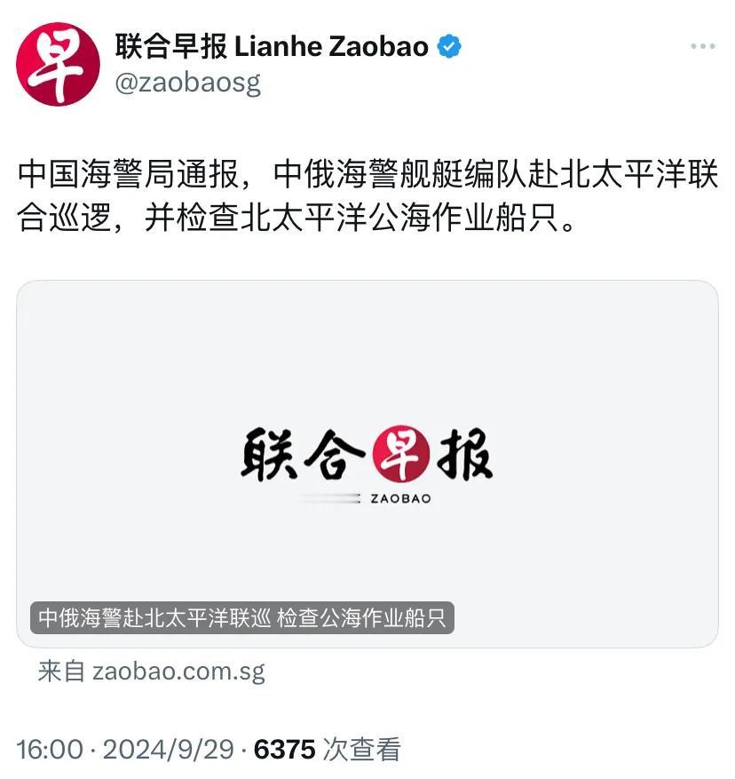 外媒今天报道:“中国海警局通报,中国和俄罗斯海警舰艇编队赴北太平洋联合巡逻,并检查北太平洋公海作业船只。”(图五)(图四冒着浓烟的海警船为俄方船只) [机智]评几句:中俄海警在北太平洋公海举行联合演习和巡航,并不针对任何第三方。中俄海警联合巡逻彰显双方维护海上公共秩序、化解海上安全风险的坚定决心。