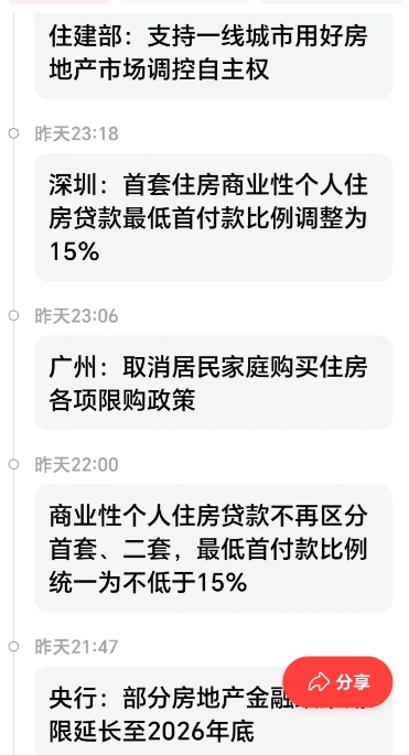 三大城市上海深圳广州深夜发文,楼市步入空前政策宽松期,首付比例低至15%,大家赶紧来买房啊,再不买房子房价又要起飞了。赶紧买吧!俺准备买一套坐等升值,可好?欢迎大家给出合适的建议。