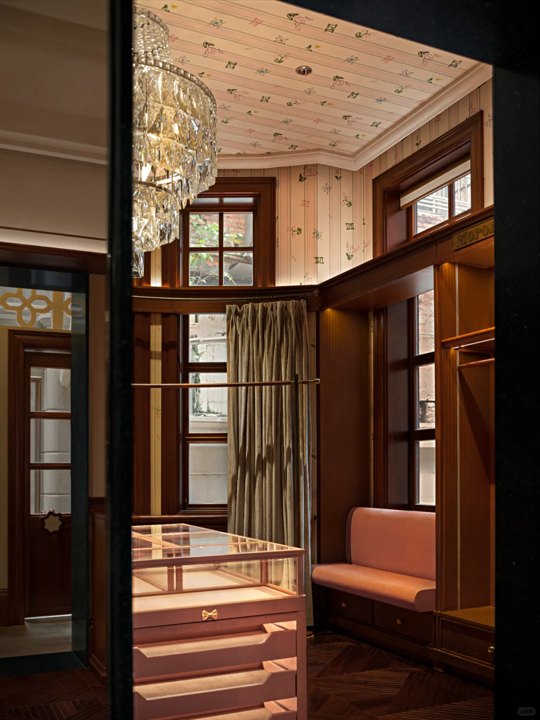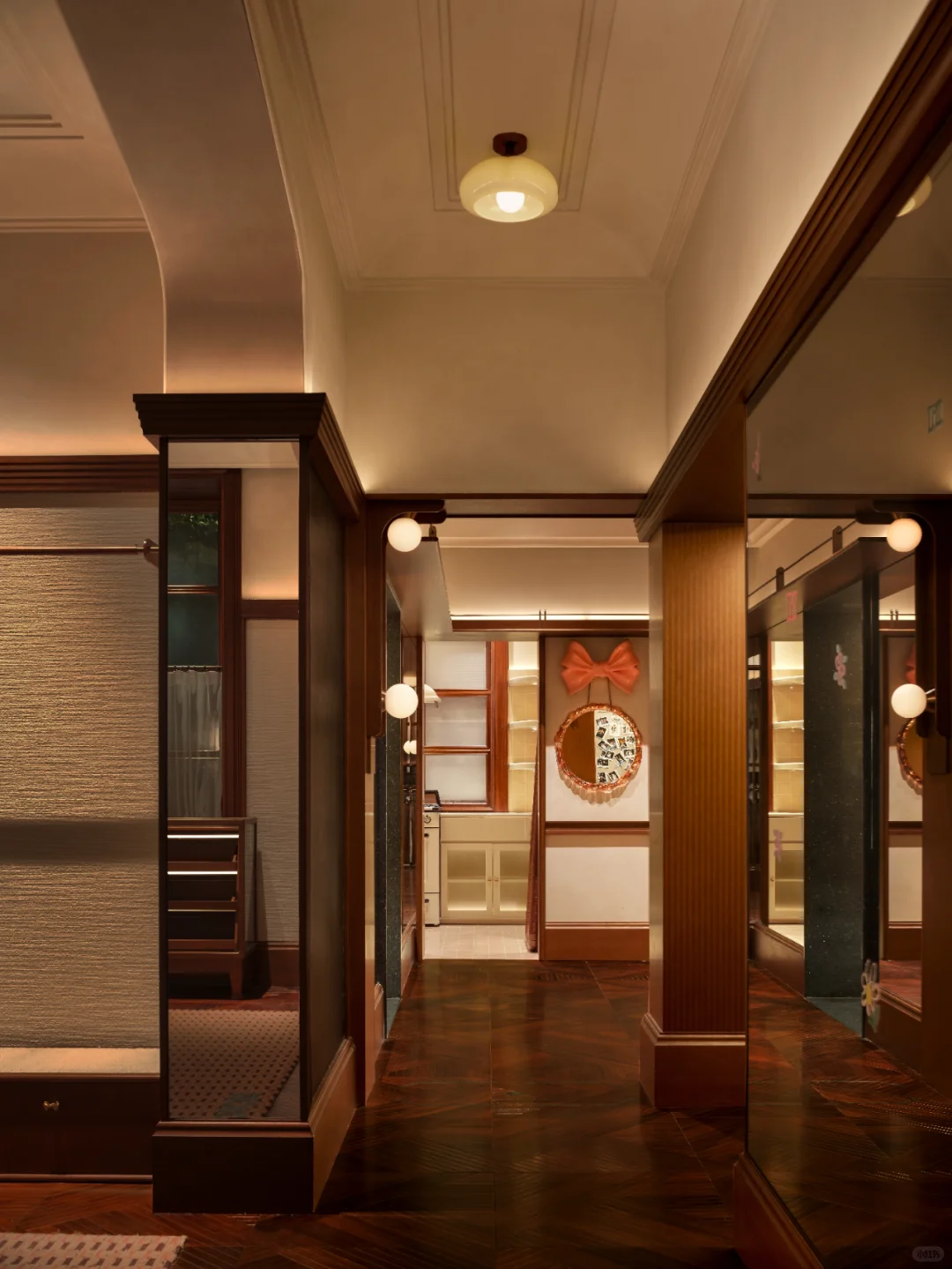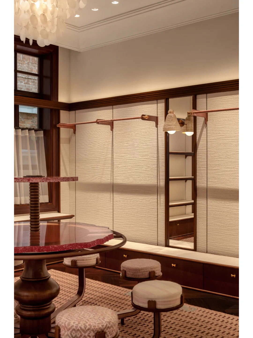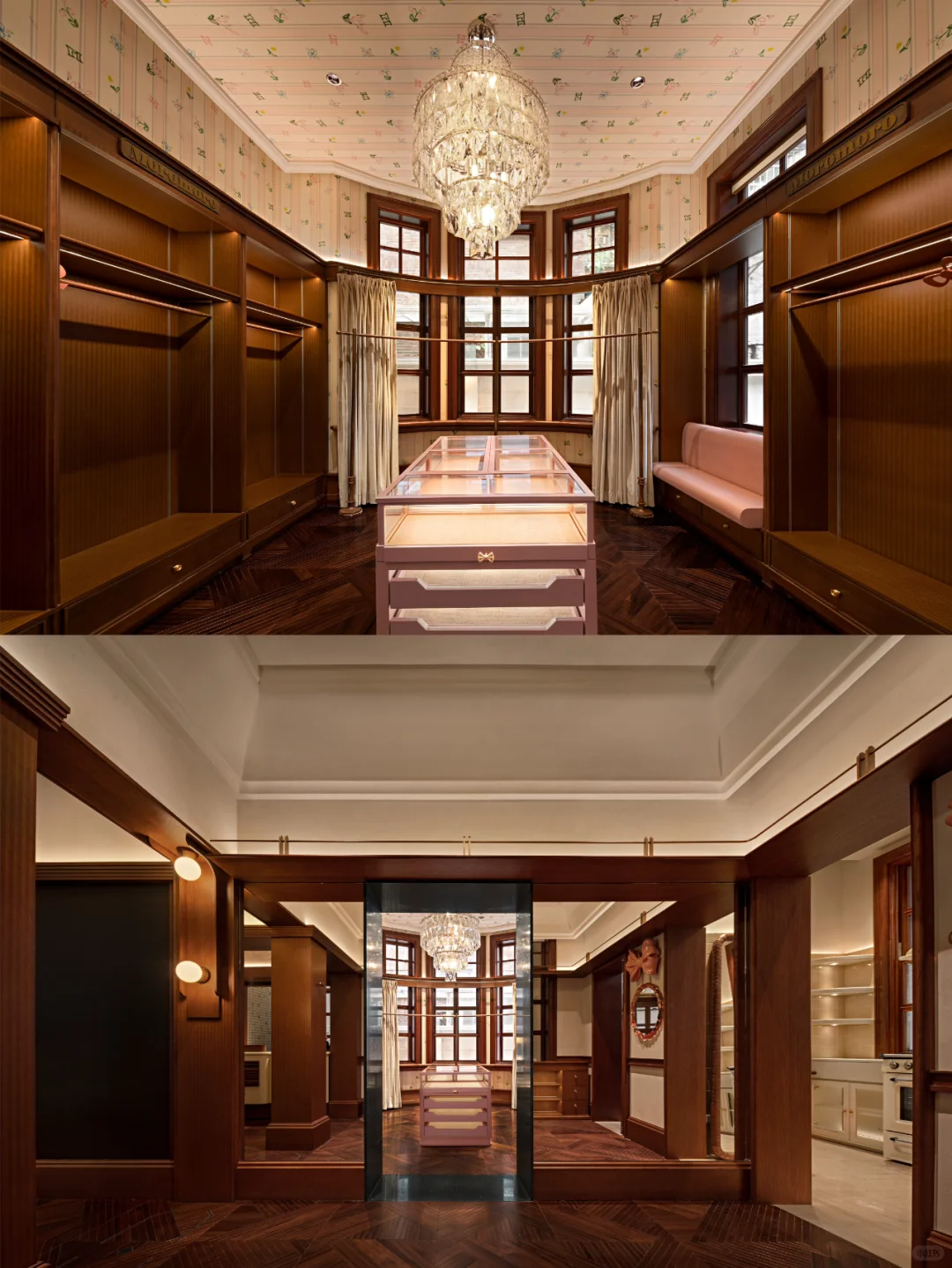 暖色调照明光线为空间营造温柔的视觉氛围,放松心情沉浸式体验时装带来的愉悦想象。材料上延续温暖胡桃木色,呼应整体空间复古美学的主基调。