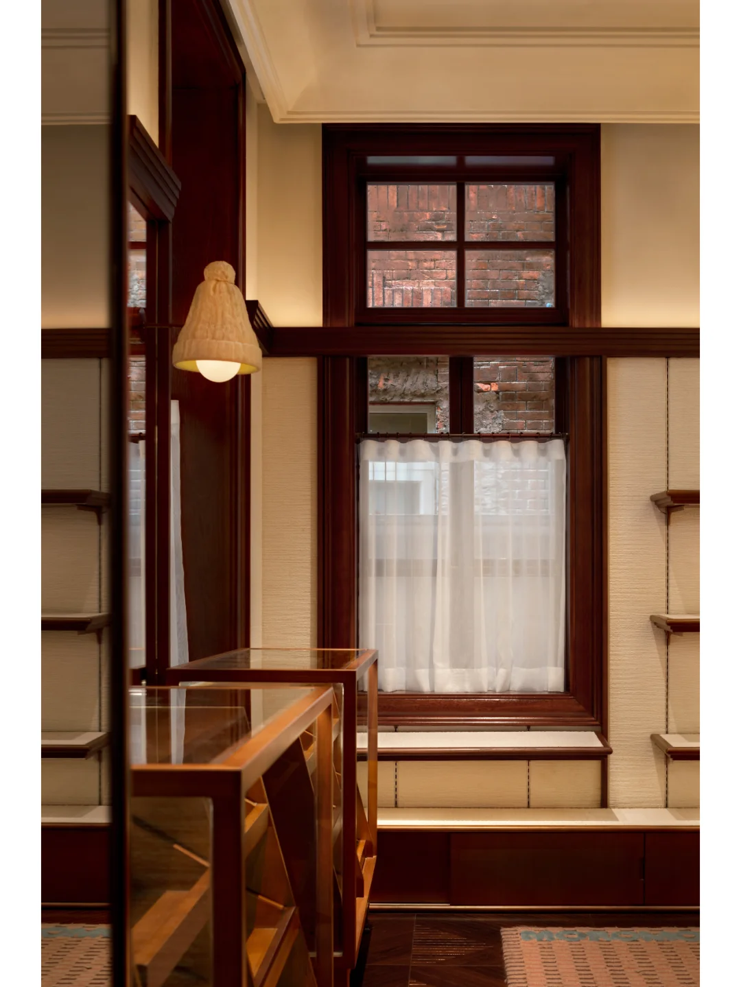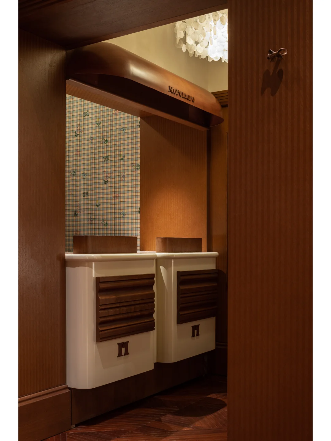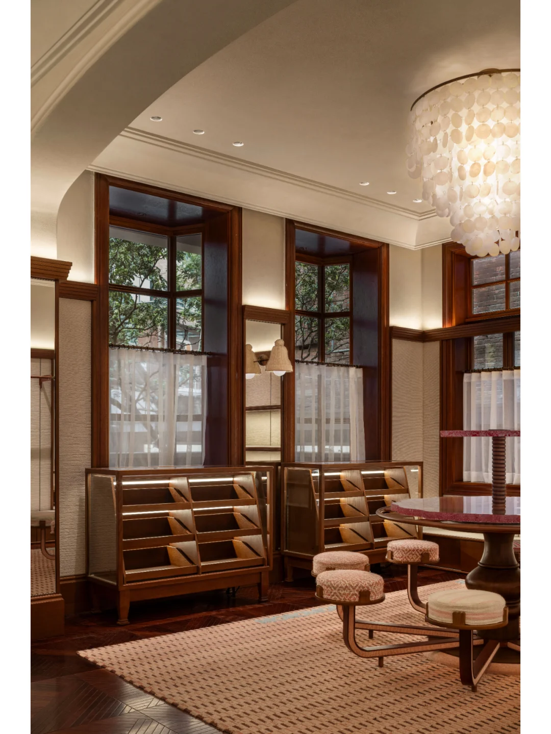 暖色调照明光线为空间营造温柔的视觉氛围,放松心情沉浸式体验时装带来的愉悦想象。材料上延续温暖胡桃木色,呼应整体空间复古美学的主基调。
