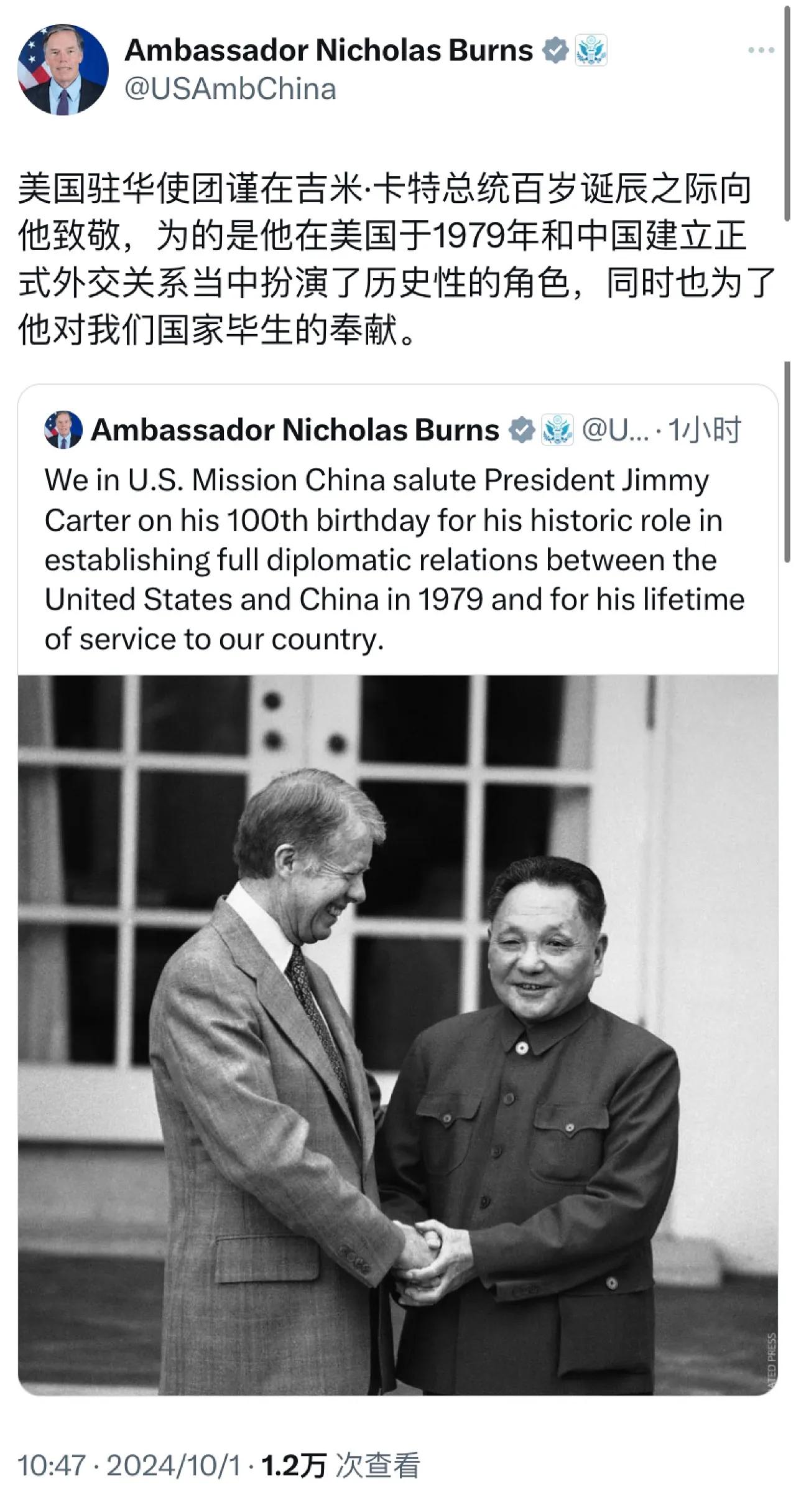 美国驻华大使伯恩斯今天(10月1日)写道:“美国驻华使团谨在吉米·卡特总统百岁诞辰之际向他致敬,为的是他在美国于1979年和中国建立正式外交关系当中扮演了历史性的角色,同时也为了他对我们国家毕生的奉献。” [机智]评几句:今天是中国国庆节。合则双赢,斗则两败。中国领导人邓小平与美国总统卡特的握手,标志着中美合作新时代的开启。实际上,在全球化的浪潮之下,中美两大国之间的合作无疑是唯一正确的抉择,别无他途。然而,无论是民主党的拜登与哈里斯,亦或是共和党的特朗普,都秉持零和博弈的观念,认为护持美国霸权地位就必须遏制中国的发展。