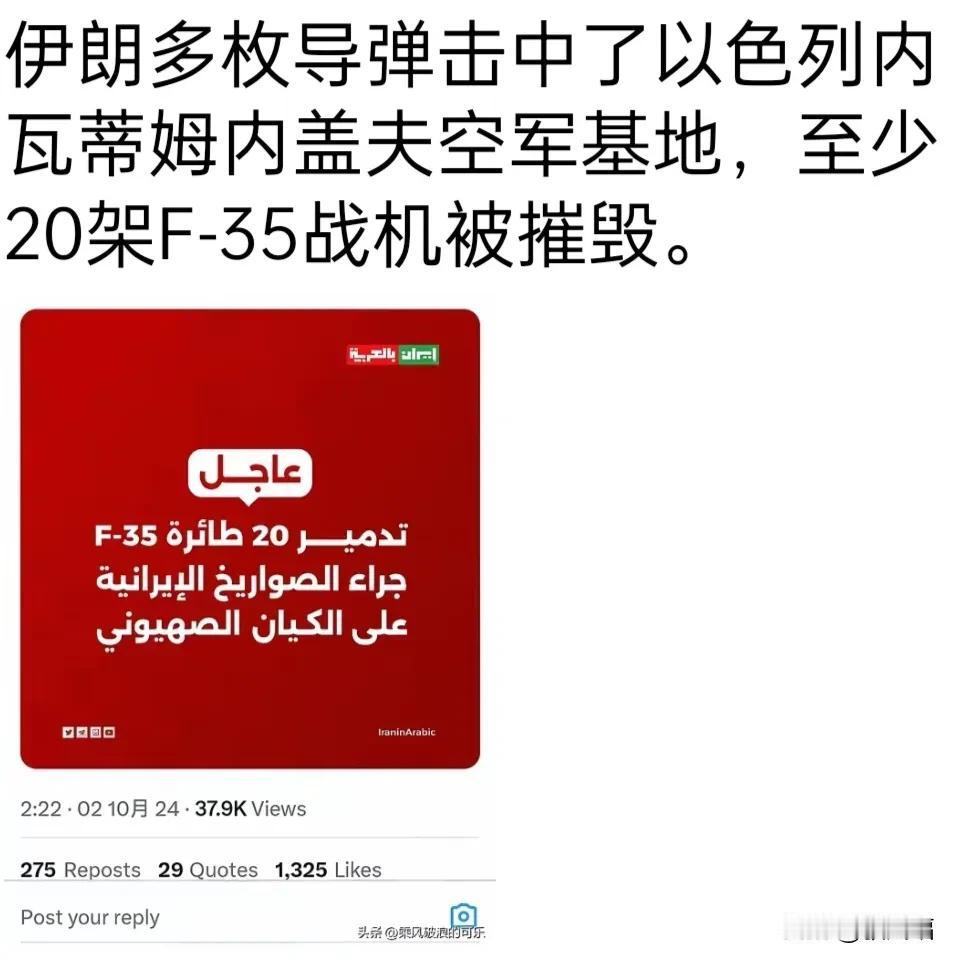 内塔尼亚胡称:伊朗用数百枚导弹袭击了以色列。这次袭击“失败了”,多亏了以色列先进的防空系统。 伊朗伊斯兰革命卫队发布声明,称“尽管相关地区受到最先进、最大规模防空系统的保护,但90%的导弹都成功击中目标”。 央视总台记者亲历伊朗导弹袭击以色列,总共发射约200枚导弹。 网友说:损毁了以色列20多架F35战机。 这到底是谁在撒谎?