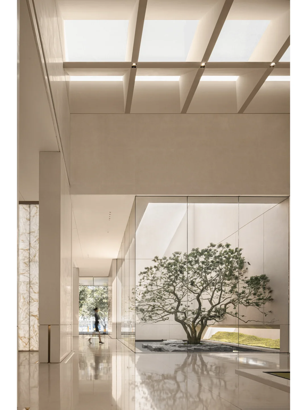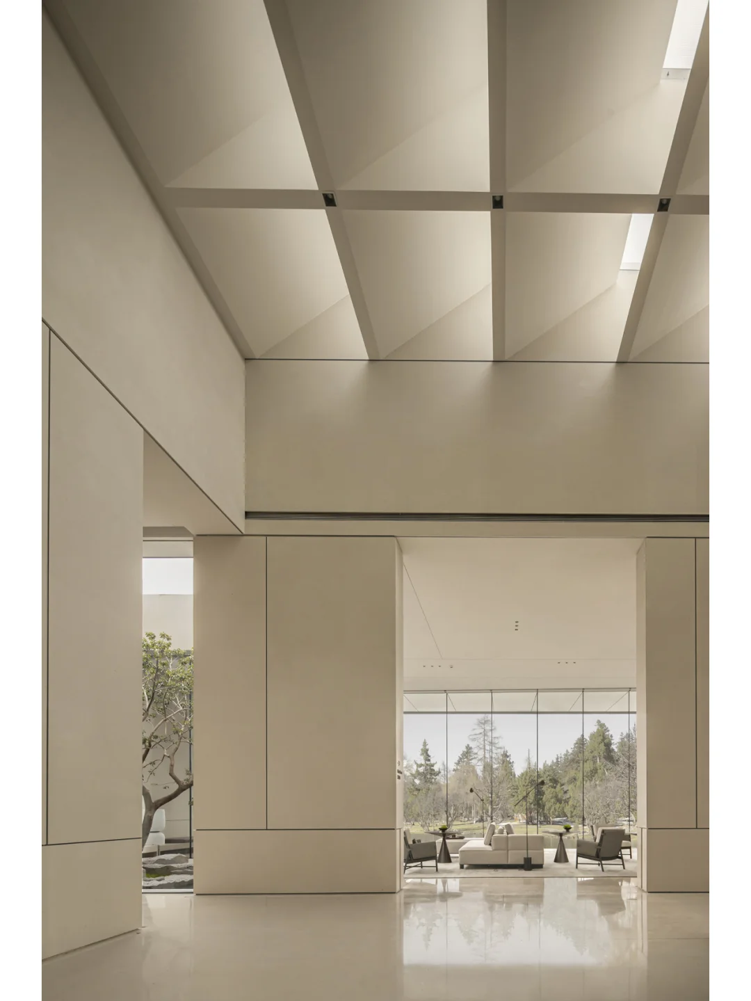 项目外观线条简洁明快,将现代感的空间延伸,让坚硬的外墙变得轻盈灵动。室内不同于传统的吊顶,通过结构重塑和角度修改,构建出大截面网格,让参观者在日光的穿梭中,感受到时间的流逝。