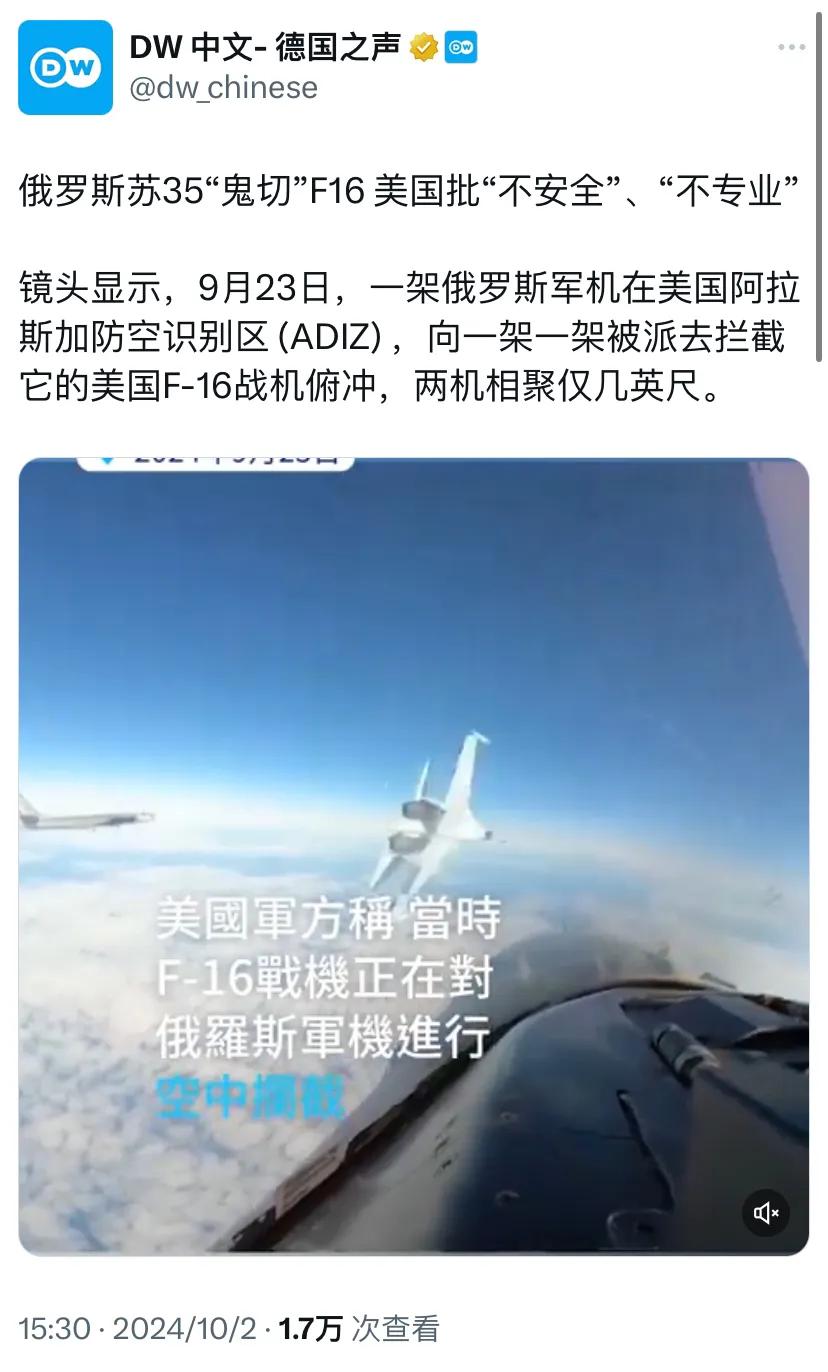 德国之声今天报道:“俄罗斯苏35‘鬼切’F16,美国批‘不安全’、‘不专业’。镜头显示,9月23日,一架俄罗斯军机在美国阿拉斯加防空识别区 (ADIZ) ,向一架被派去拦截它的美国F-16战机俯冲,两机相距仅几英尺。” [机智]评几句:确实不安全,但是非常专业,要是不专业就撞上了。从视频来看,当苏35切入到F16的前方时,F16出现了因气流或操作引发的摇晃,但摇晃的幅度比较明显。(将视频转换成了GIF动图格式,在压缩转换过程中,动图有些卡顿。)