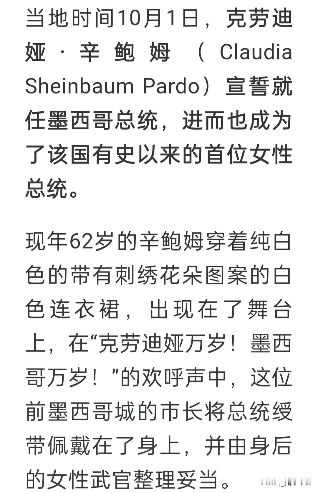 重大新闻,重大新闻!真是牵一发动全身啊。 墨西哥历史上首位女总统就职,看形象这女总统挺正点。刚好选在我国国庆这么喜庆的日子,无疑想沾一下我们国家的喜气。相比,小日本也是选在10月1日组建内阁和石破茂任职,这明显就有点恶心人了,石破茂一上台就想干点“大事”,连印度外长第一个跳出来反对,他的那点“破”事,当然我国自然不受欢迎了。 言归正传,墨西哥女总统就职,这位女总统相比美国女副总统哈里斯自然漂亮多了,这明显也是给美国人民提了个醒:“你们就没必要选这样上不了台面、形象不佳的有前科的黑寡妇上台了”,别学样了,恐怕美国第一位女总统诞生的事就要夭折了。 另外此次墨西哥女总统就职,普京收到了邀请函,普京确实抽不开身再加上遭到27国的围堵,仅在电话里表达了祝贺。巴西总统亲自参加了就职典礼,但在返回的时候总统专机出了点意外《说是机械故障),只能返航迫降继续待在墨西哥。这就奇怪了,参加墨西哥就职典礼可能惹到了漂亮国生气了,不排除漂亮国在总统专机上使坏。要知道,巴西是金砖五国之一,总统千万不能出事啊!如果巴西总统出事,谁会幸灾乐祸呢?当然是美印了,印度一直在金砖国家里充当搅屎棍,对新的支付结算系统一直耿耿于怀呢! 对此,大家如何看?