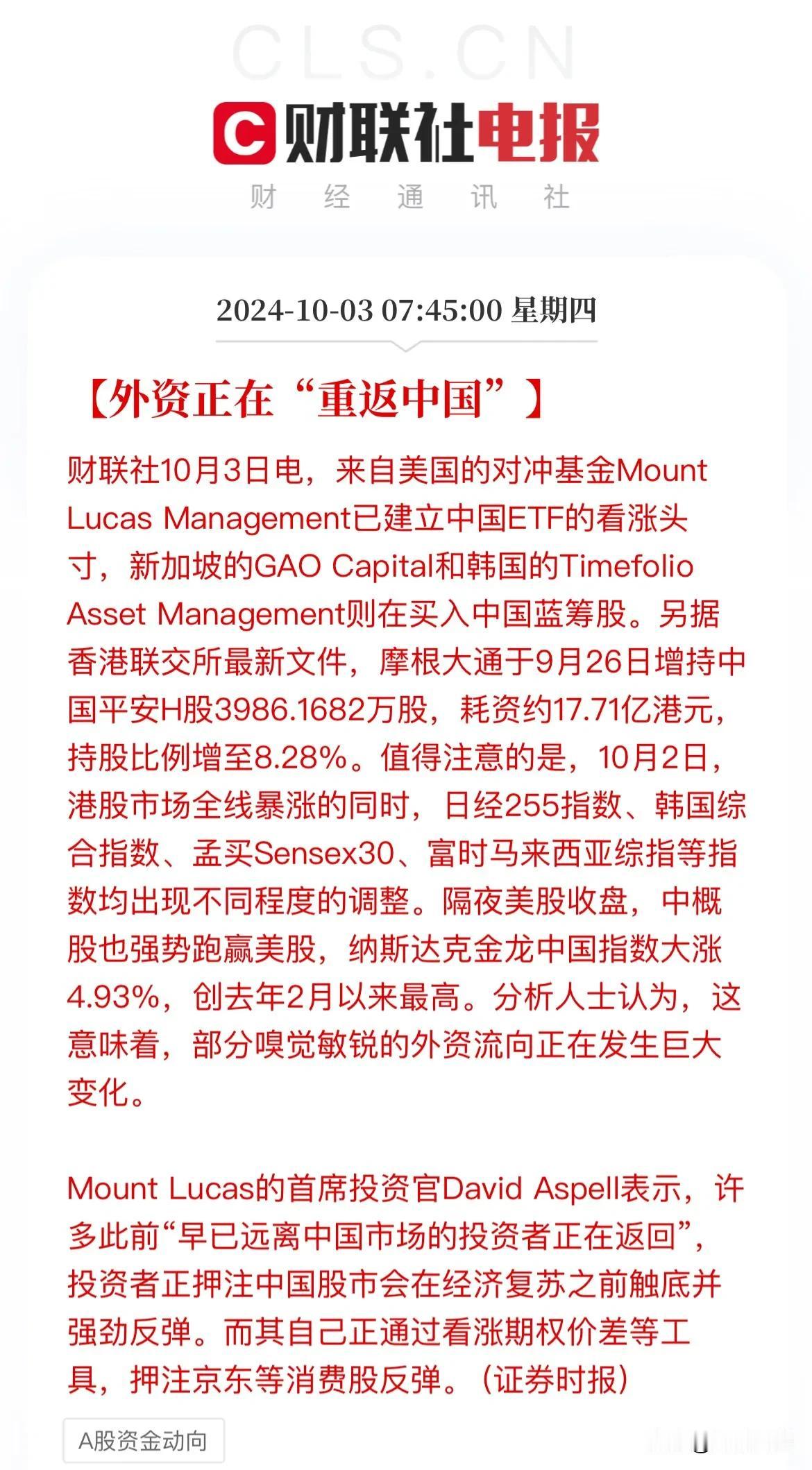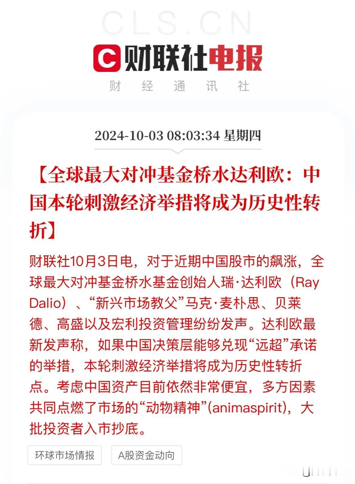 大水漫灌!彭博:先前离开的中国股市的资金正在“马不停蹄”回流 外资看多做多A股已经成为既定的事实了, 彭博报道,先前从中国股市流出去日本股市和其他东南亚股市的资金即将回流中国,如鲨鱼闻到一股味道一样,蜂拥而至, 9月7日开启测试就是为此做准备的, 全球最大对冲基金桥水达利欧表示:中国本轮对经济刺激的措施将成为历史的转折点, 此外华尔街机构贝莱德、高盛、宏利投资管理纷纷发声表示,投资者正在押注中国股市会在经济复苏之前触底并强劲反弹#中国股市起飞了# #分享股市之喜悦# #分享股市要闻# #分享股市讯息# #分享股市大事# #股市好消息共赏#