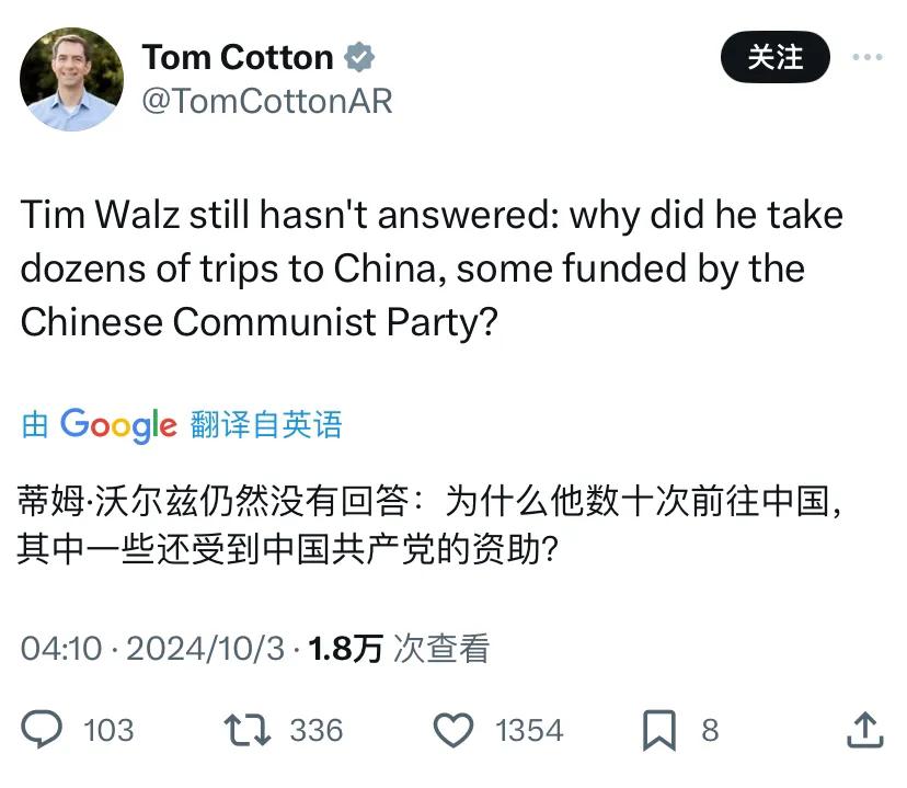 【美国大选又拿中国说事】 美国共和党籍参议员汤姆·科顿今天(北京时间10月3日)写道:“(民主党副总统候选人)蒂姆·沃尔兹仍然没有回答:为什么他数十次前往中国,其中一些还受到中国的资助?” 美国共和党籍众议员兰斯·古登今天(北京时间10月3日)也写道:“谁会拜访我们的头号对手 30 次?谁对他们访问中国撒了谎?谁赞扬中国的共产主义制度?谁担任与中共有关系的研究所的研究员?” [机智]评几句:其实蒂姆·沃尔兹的政治倾向并不算亲华,但是他过往在中国的经历,成为共和党的攻击目标。蒂姆·沃尔兹在1989年至1990年期间,在广东省佛山市担任佛山一中的外教,主要教授英语。后来,他还担任过澳门理工大学的客座研究员。蒂姆·沃尔兹曾数十次访华,他和妻子的新婚蜜月也是在中国度过的。