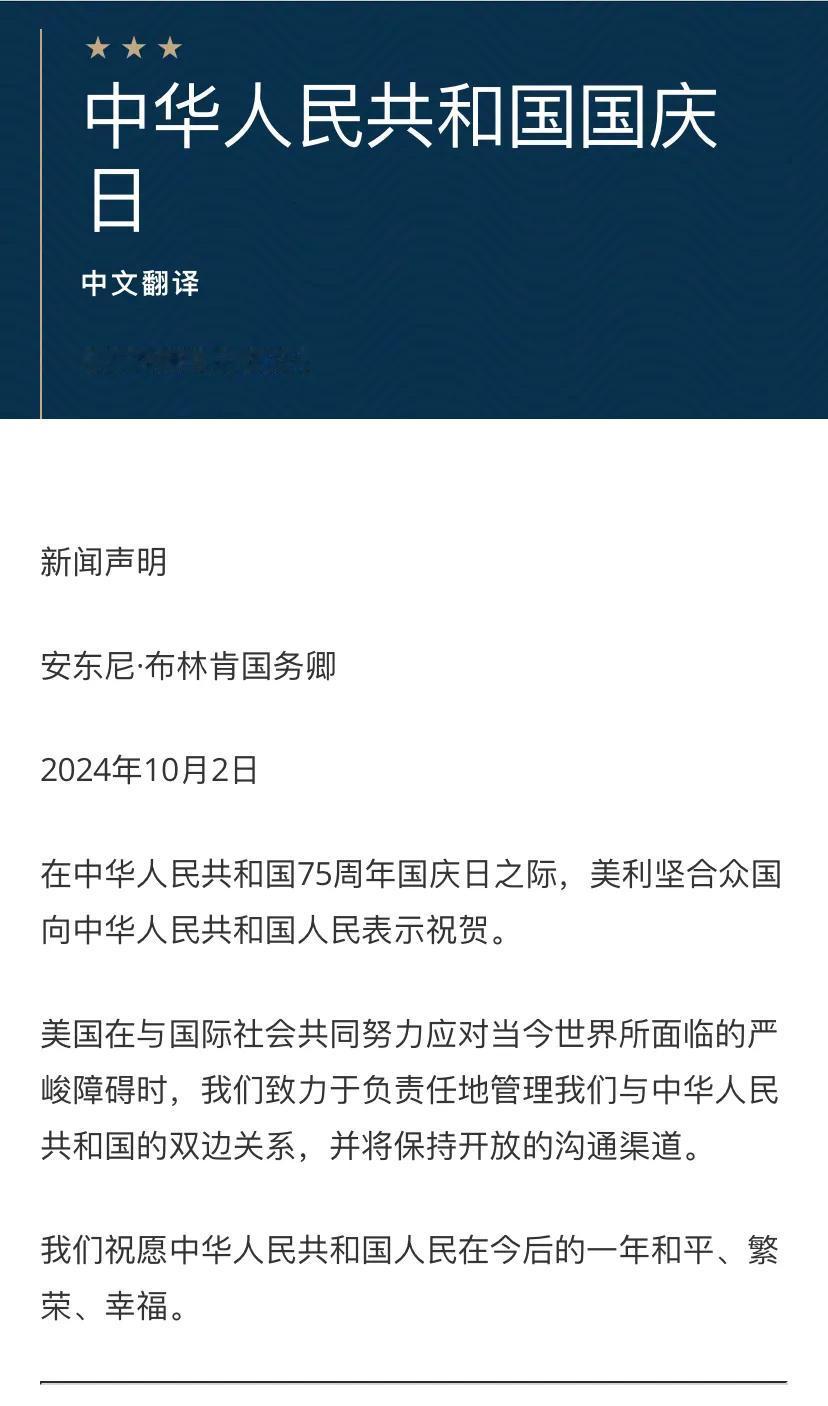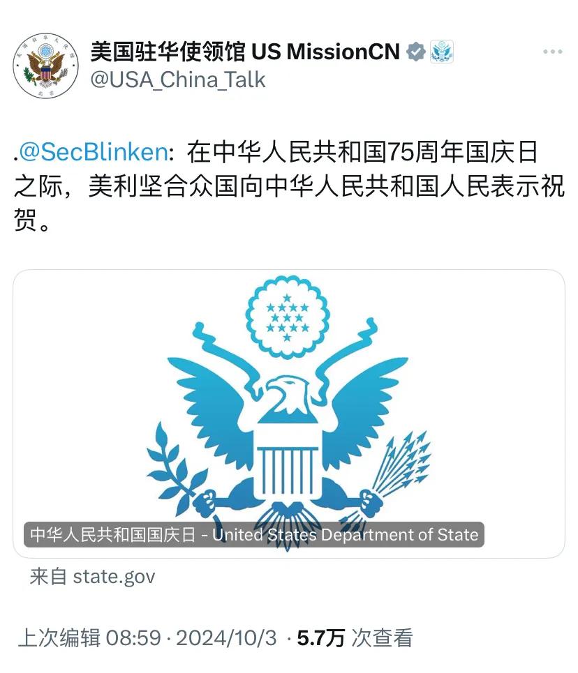 【美国国务卿布林肯祝贺中华人民共和国75周年国庆】昨天有多家媒体关注到,美国国务院今年反常地未在10月1日前祝贺中国国庆。去年9月29日、前年9月30日,美国国务院曾正式发贺电祝贺中国国庆。今天(10月3日)美国驻华使领馆写道:“布林肯:‘在中华人民共和国75周年国庆日之际,美利坚合众国向中华人民共和国人民表示祝贺。’”贺信全文见图三。 [机智]如果你真诚地希望向对方表达生日的祝福,理应提前进行,而非延后。毕竟,在生日庆典结束之后再去祝贺对方生日快乐,显然不合时宜。