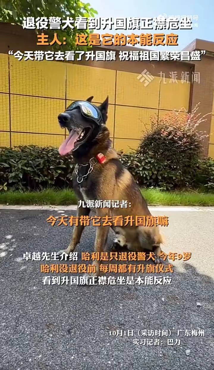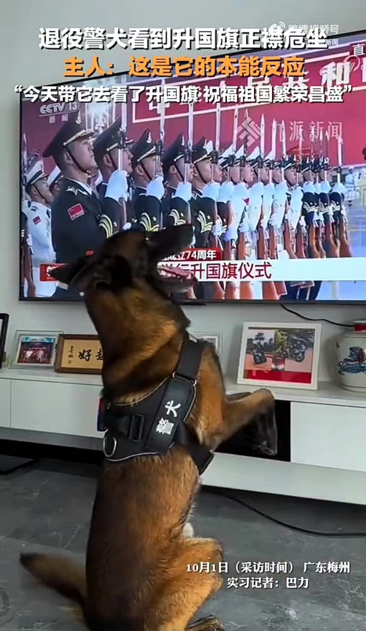 10月1日,广东梅州一名男子发视频称,自家的狗狗是一只退役警犬,今年已经9岁了,早上看到电视上播放的升旗仪式,就立马正襟危坐起来。该男子表示,退役前每周都有升旗仪式,看到升国旗正襟危坐是本能反应!