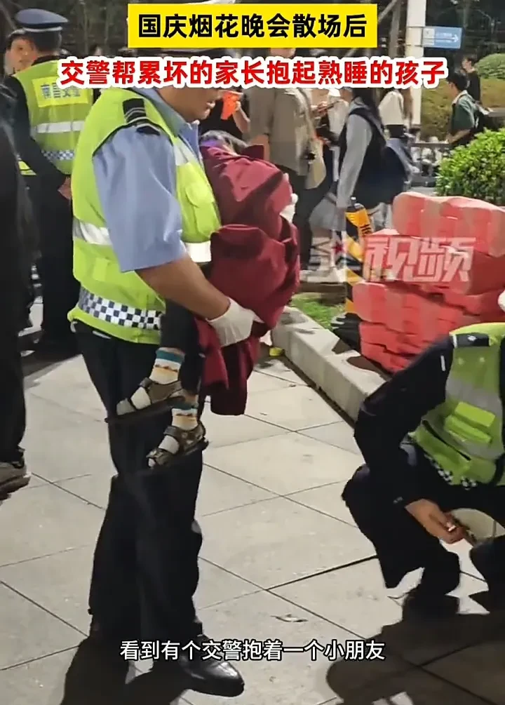 10月1日,江西南昌一名女子发视频称,在烟花晚会散场后,自己看到一位交警正抱着熟睡的孩子,模样十分温柔。之后才了解到,原来是孩子的家长抱累了,就让交警帮忙抱一下。网友:“热情周到的交警叔叔!”