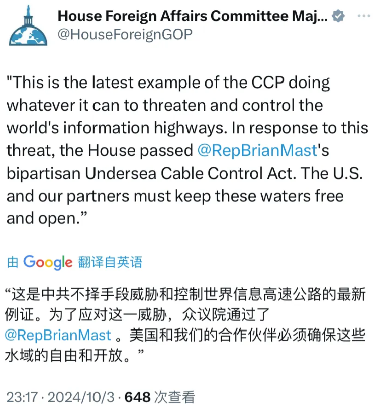 美国国会众议院外交事务委员会昨晚(北京时间10月3日晚)污蔑道:“全球95%以上的信息都是通过海底电缆传输的,其中许多电缆铺设在南海海底。中共在该地区的侵略行为使得这些电缆几乎不可能修复,对全球通信构成了严重威胁。这是中共不择手段威胁和控制世界信息高速公路的最新例证。为了应对这一威胁,众议院通过了众议员布莱恩·马斯特的跨党派《海底电缆控制法案》。美国和我们的合作伙伴必须确保这些水域的自由和开放。”