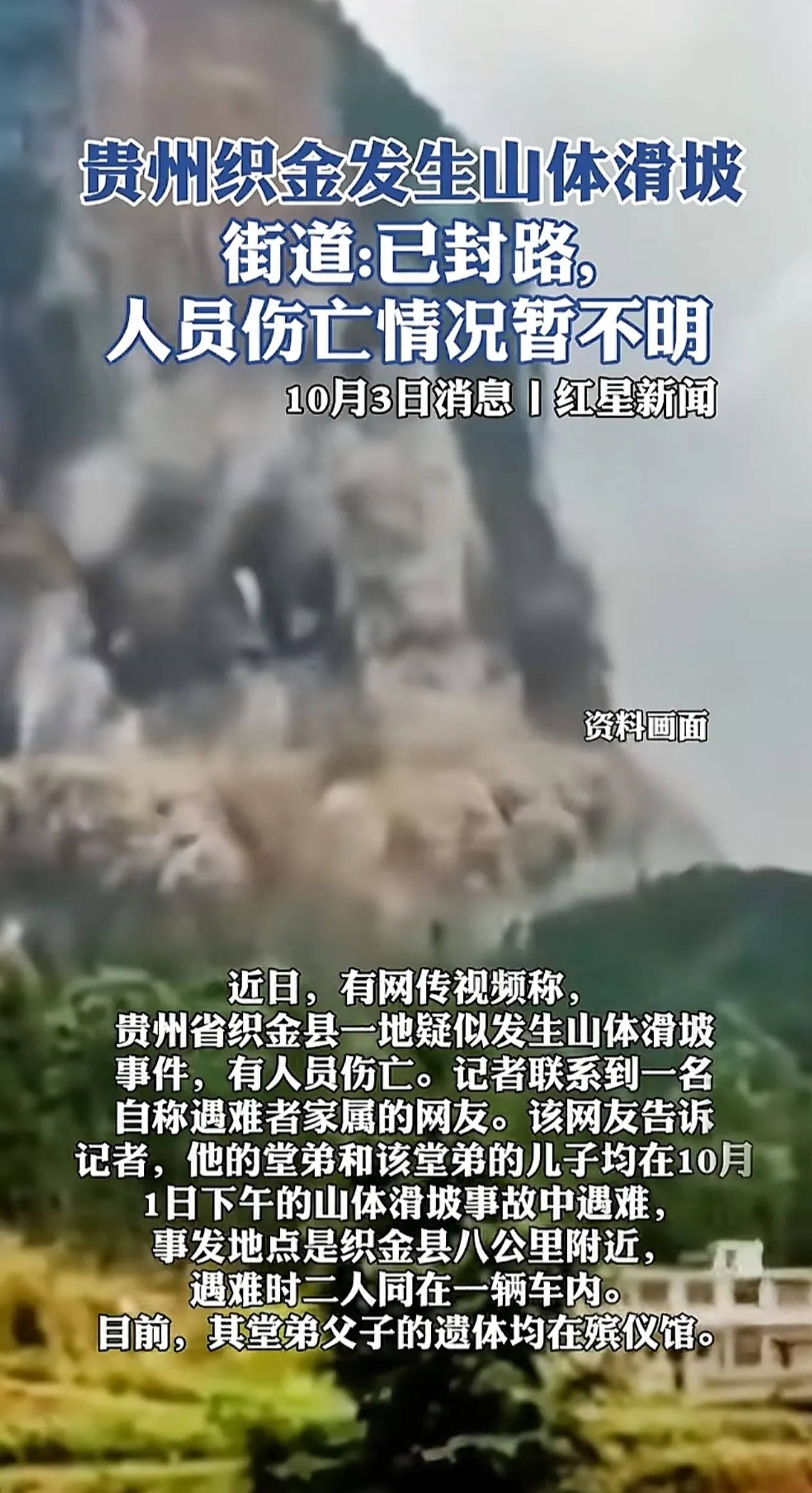 家属表示他的堂弟和堂弟的儿子,在山体滑坡事故中不幸遇难,遇难时堂弟父子二人同在一辆车内,目前两人的遗体,还存放在当地的殡仪馆内,10月3日红星新闻记者电话联系了,织金县金凤街道的工作人员。