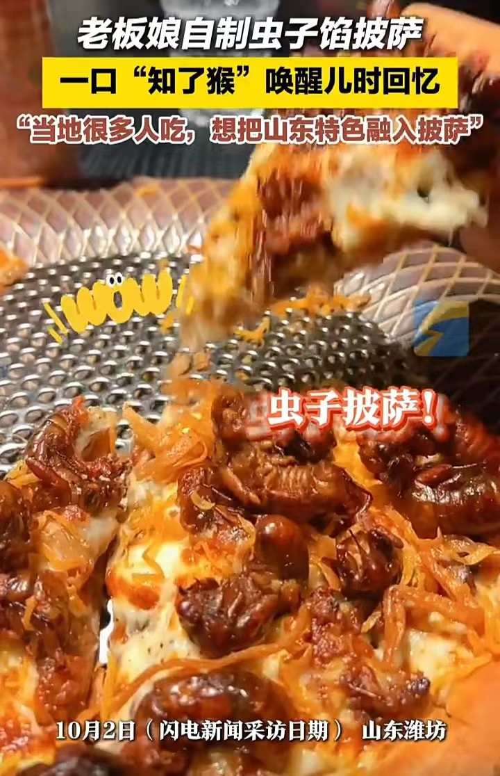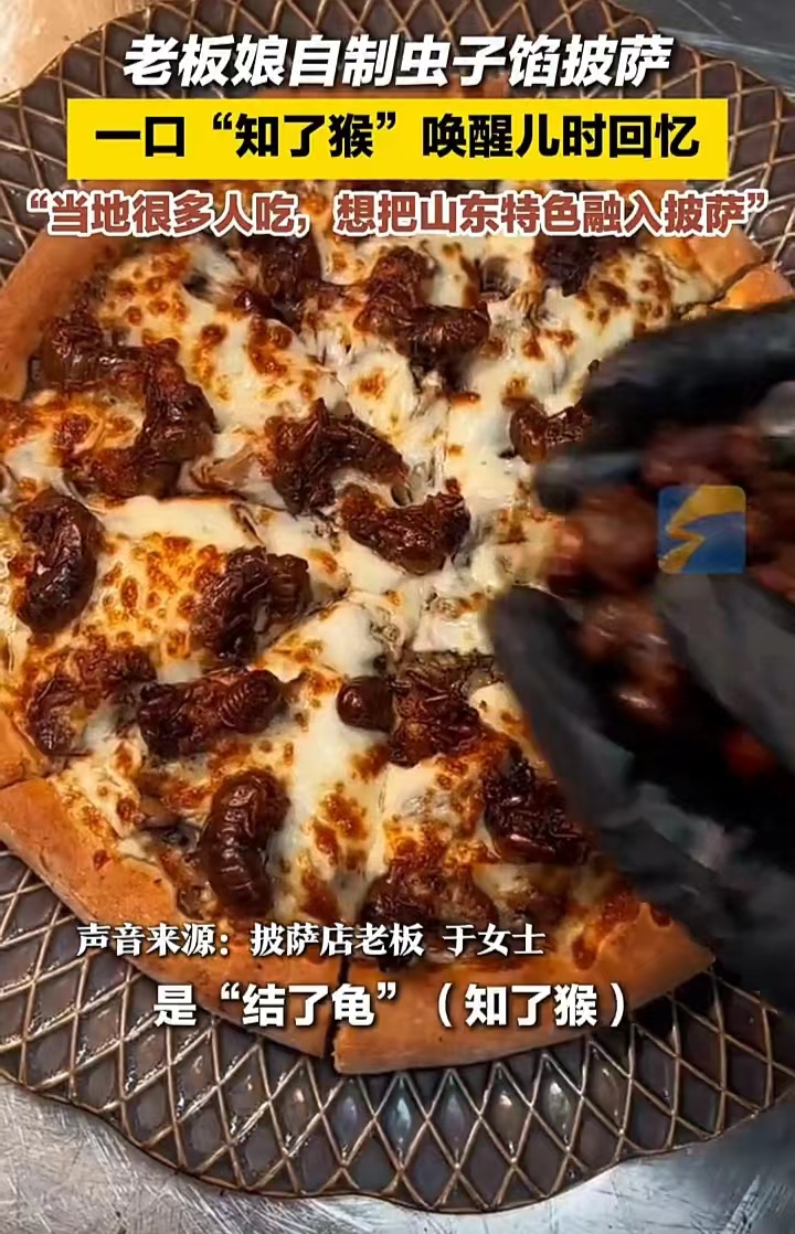 近日,山东潍坊一名餐厅老板娘突发奇想,将当地特色“知了猴”加入披萨当中,做成了全新的披萨,并且提供给顾客品尝。事后该老板娘表示,味道超级香,非常受好评。