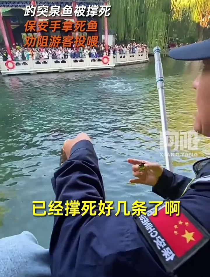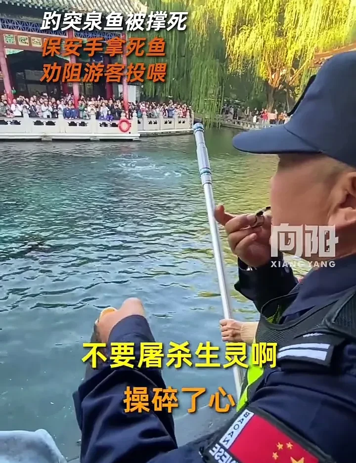 10月4日,山东济南一名网友发视频称,在趵突泉景区,一位保安大叔拿着死鱼劝阻游客投喂,“大家千万不要喂鱼,已经撑死好几条了,不要屠杀生灵。”该保安表示,不这样做的话没人相信。