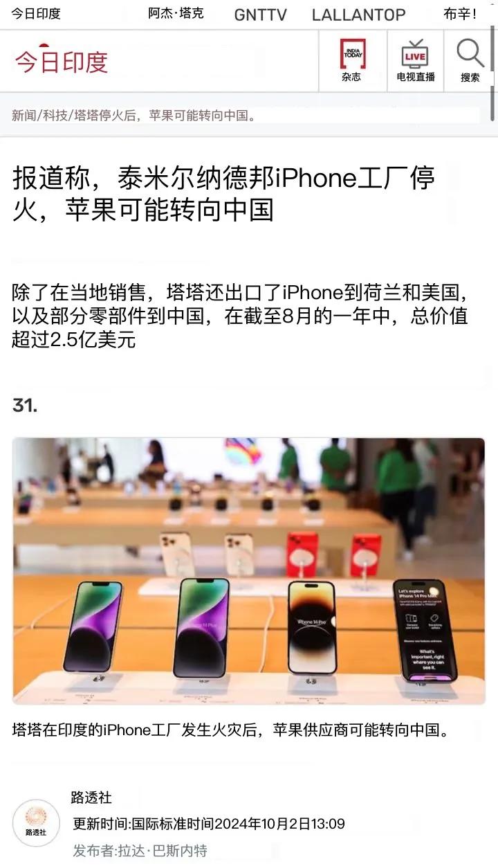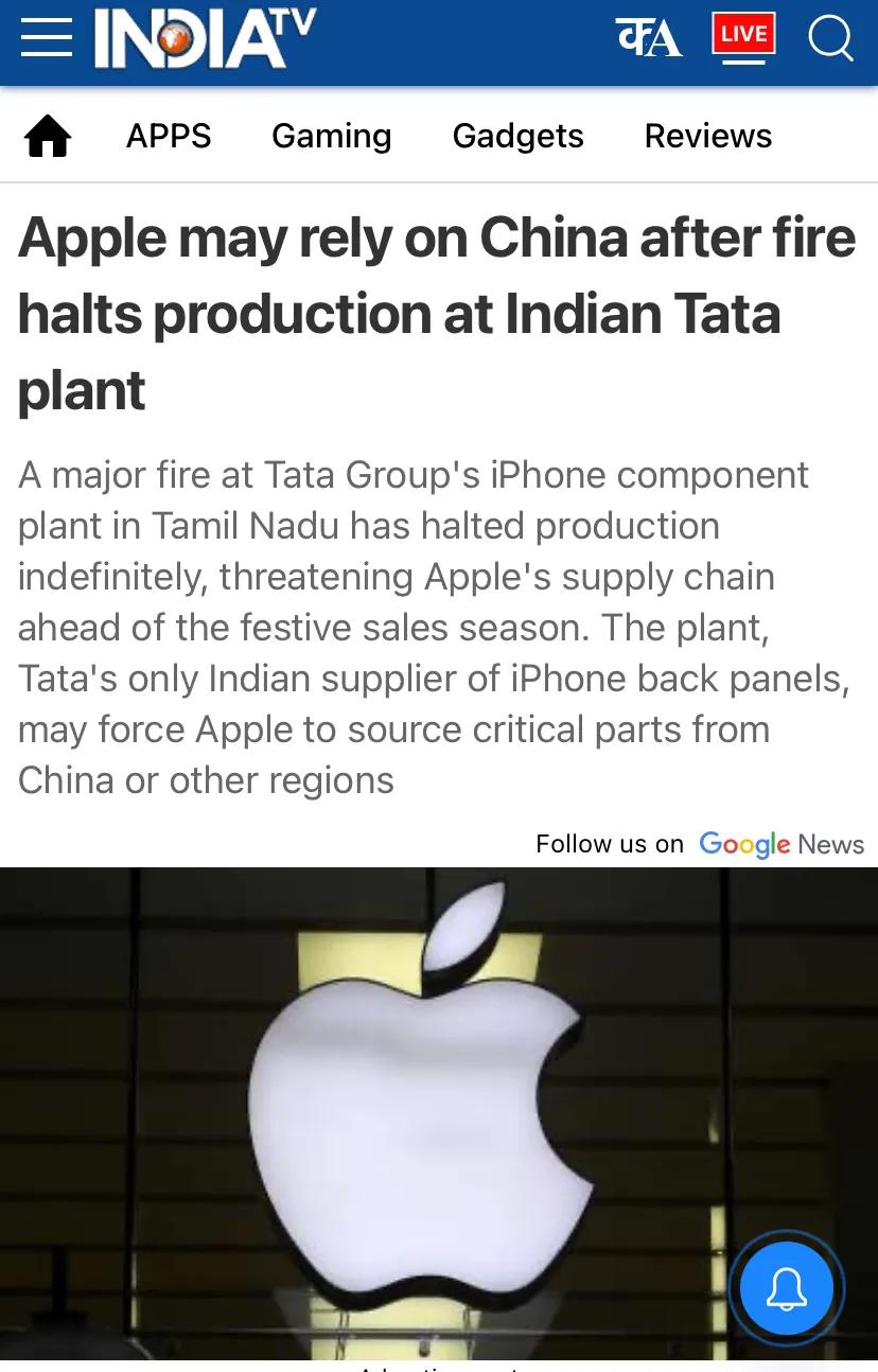 印度媒体10月1日报道:“印度塔塔工厂起火停产后,苹果可能依赖中国。”9月28日,塔塔电子位于泰米尔纳德邦的苹果iPhone零部件工厂发生大火,该事件对苹果在印度地区的iPhone供应链造成了严重影响。 [机智]评几句:印度“外企坟场”的称号,真不是白叫的,而且总会有意外产生。其实,这个iPhone代工厂是塔塔集团从台湾纬创低价强买过来的。4年前,印度工人因劳资纠纷在纬创位于Narsapur的iPhone组装工厂内实施了破坏生产设备、纵火焚烧车辆以及抢盗仓库内iPhone手机等一系列行为。最终,纬创公司因无法承受压力,被迫将其在印度的所有工厂转让给了塔塔集团。