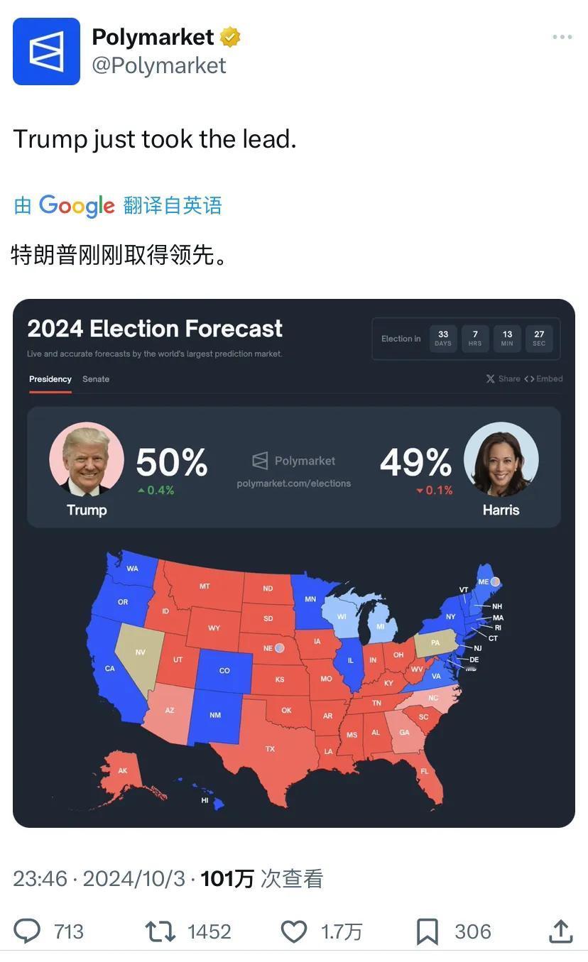 马斯克将于本周六(10月5日)参加特朗普在宾夕法尼亚州巴特勒举行的集会。特朗普今天(北京时间10月4日)写道:“周六巴特勒——历史性时刻!”马斯克转发并评论:“我会去支持!” [机智]补充几句:7月13日,特朗普在巴特勒的竞选集会上遭遇第一次“未遂刺杀”事件后,他曾数次表示自己将回到巴特勒再次进行集会。特朗普已确定当地时间周六重返巴特勒,完成此前未完成的演说。此外,目前选情依旧微妙,图二是Polymarket的最新预测数据。