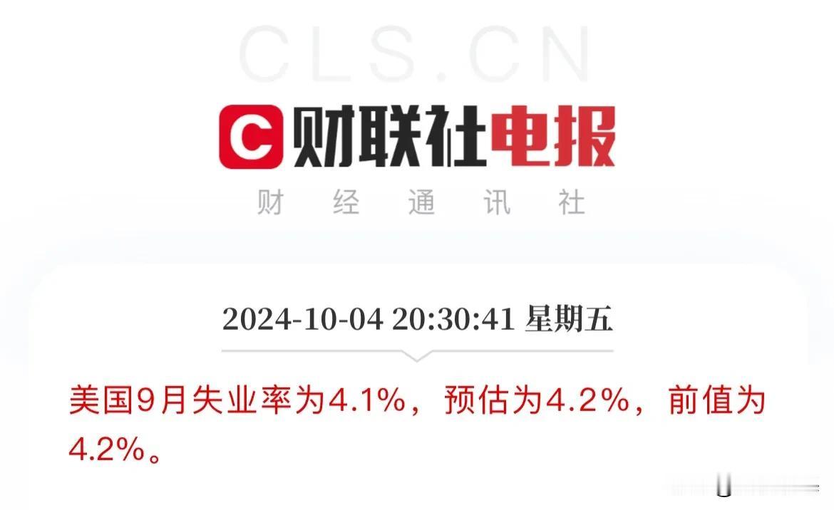 重磅数据出炉!非农数据爆了! 非农数据大超预期, 失业率有所下降, 美国9月非农就业人数增加25.4万人,预估为增加15万人,前值为增加14.2万人。 美国9月失业率为4.1%,预估为4.2%,前值为4.2%。