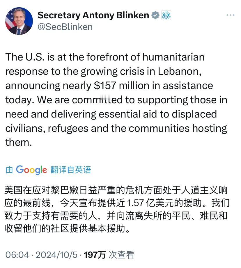 美国国务卿布林肯今天(北京时间10月4日)写道:“美国在应对黎巴嫩日益严重的危机方面处于人道主义响应的最前线,今天宣布提供近1.57亿美元的援助。我们致力于支持有需要的人,并向流离失所的平民、难民和收留他们的社区提供基本援助。” [机智]评几句:美国政府一边给以色列提供军事援助,一边给黎巴嫩提供人道主义援助。左手给炮弹,右手给安慰?美国政府真是分裂。此外,在布林肯所发的帖文下面,一些美国民众表示,为什么受到飓风侵袭的美国公民只能获得750美元,而且还不是援助,而是贷款。