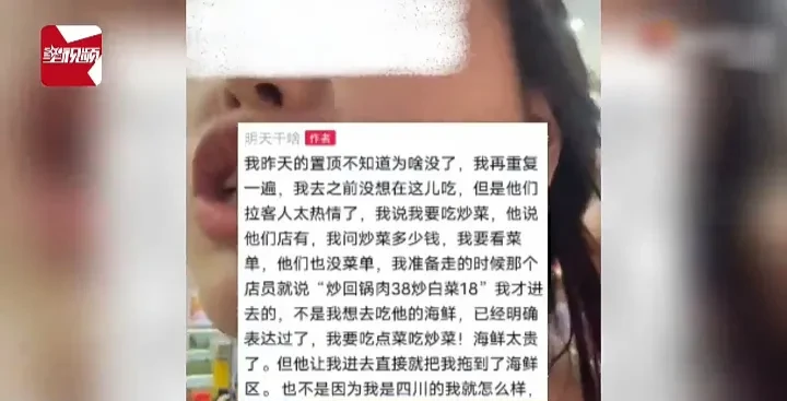 10月3日,广西北海一名女子发视频称,自己被一家餐厅热情拉客,进店前自己明确表示想吃炒菜,店家回应可以,谁料进店后,店家直接给自己推荐238元的海鲜,自己说了句太贵后,立马遭到店家嘲讽。