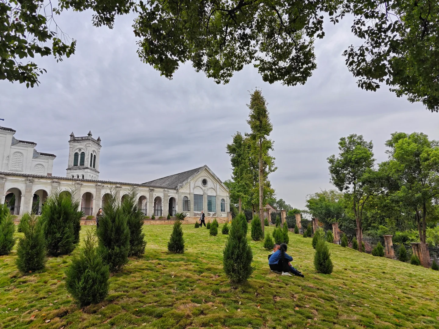 教堂外面里面和外面都有很大的草坪,外面还有璧山的饮用水源地:金堂湖,周围地势只有小山,也不高,所以这里可以说山清水秀,怪不得法国人要选择这里。由于和带火这里,国庆期间露德堂颇有点人满为患,里面全是游客在各种拍,当然基本都是女生,男的都在陪拍或者闲逛。所以其实大家只是觉得这里好看出片,但游客里面没几个了解露德堂的历史,也不会去了解洋教在华传播的故事。当然就更没几个人信这个了。毕竟国人大都是啥庙都进啥佛都拜,主打一个没信仰就是最大的信仰。