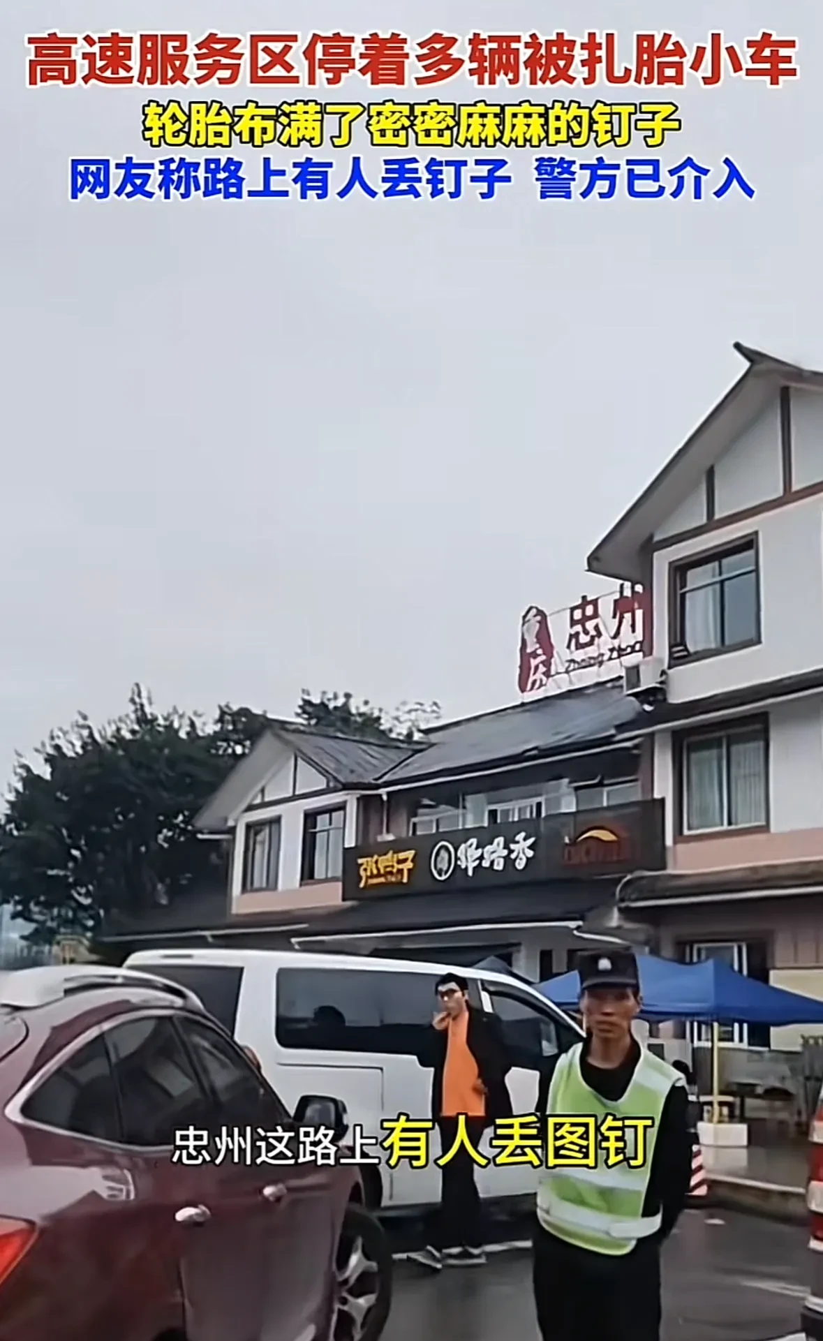 高速服务区停放多辆被扎胎小车,网友称有人故意丢钉子。 忠州一路上有人故意丢钉子,