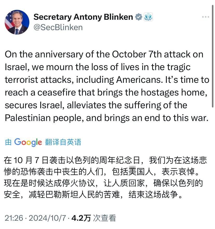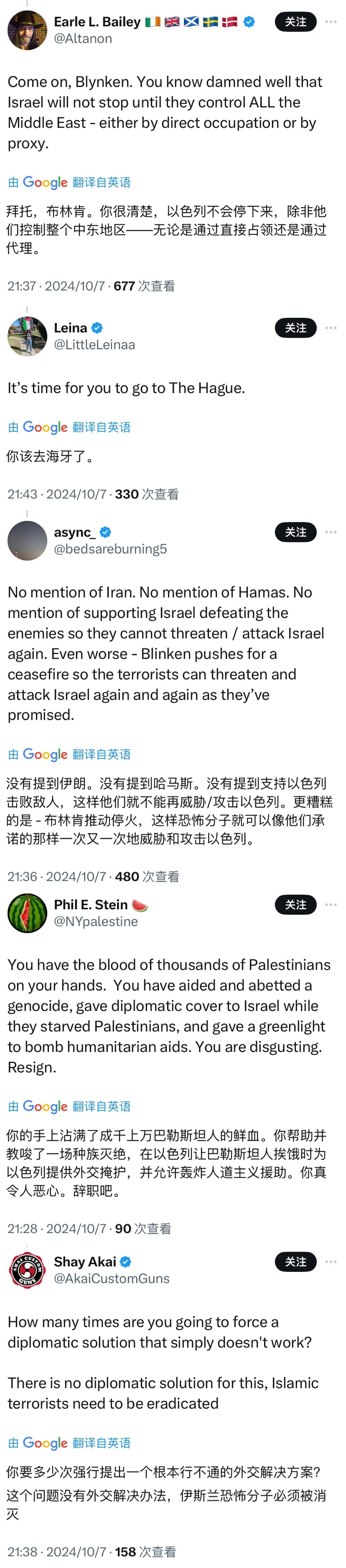 美国国务卿布林肯今晚(北京时间10月7日晚)写道:“在 10 月 7 日袭击以色列的周年纪念日,我们为在这场悲惨的恐怖袭击中丧生的人们,包括美国人,表示哀悼。现在是时候达成停火协议,让人质回家,确保以色列的安全,减轻巴勒斯坦人民的苦难,结束这场战争。” [机智]补充几句:一些网民在布林肯的帖子下留言(见图三): 网民A:“拜托,布林肯。你很清楚,以色列不会停下来,除非他们控制整个中东地区——无论是通过直接占领还是通过代理。” 网民B:“你该去海牙了。” 网民C:“没有提到伊朗。没有提到哈马斯。没有提到支持以色列击败敌人,这样他们就不能再威胁/攻击以色列。更糟糕的是 - 布林肯推动停火,这样恐怖分子就可以像他们承诺的那样一次又一次地威胁和攻击以色列。” 网民D:“你的手上沾满了成千上万巴勒斯坦人的鲜血。你帮助并教唆了一场种族灭绝,在以色列让巴勒斯坦人挨饿时为以色列提供外交掩护,并允许轰炸人道主义援助。你真令人恶心。辞职吧。” 网民E:“你要多少次强行提出一个根本行不通的外交解决方案?这个问题没有外交解决办法,伊斯兰恐怖分子必须被消灭。” [机智]评一句:如何解决巴以冲突,如何为中东带来和平,观点分裂,立场先行。