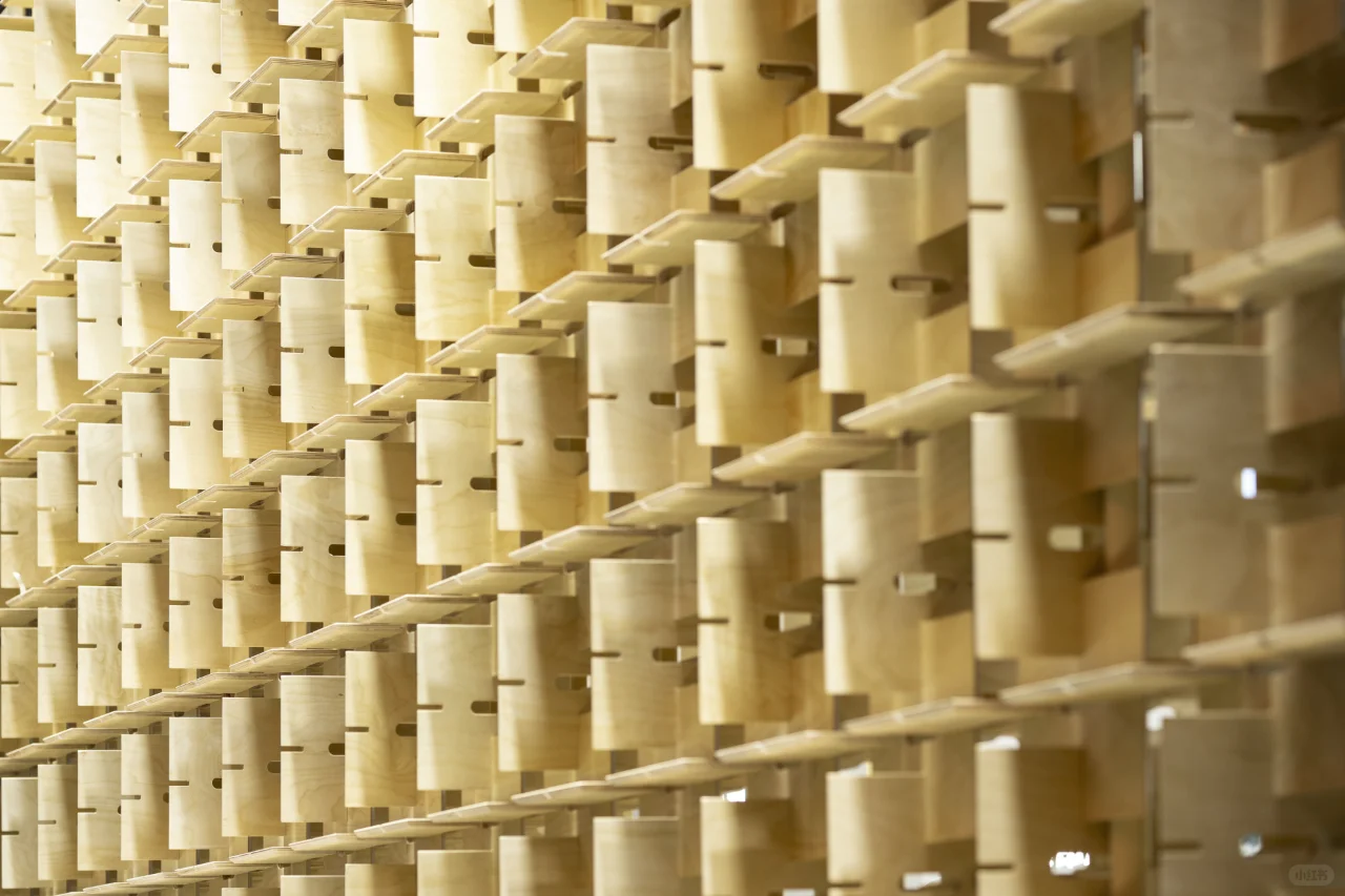展馆由四面木屏风插片(共有7524个)所搭建的墙体装置所环绕。展会期间,墙体将逐步拆卸,拆下的插片可组建为一个个收纳盒,从而一步步呈现展馆的全貌。