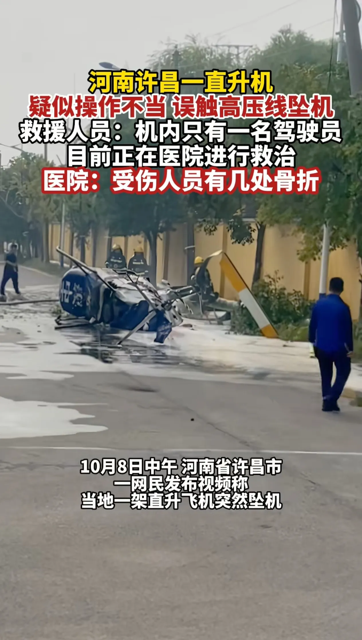 河南许昌一直升飞机低空飞行时误触高压线坠机!驾驶员身体多处骨折被送医!10月8日中午,河南省许昌市有目击者发视频称,在当地一处马路上有一架直升飞机突然坠落,坠落后发出了很大的响声,附近很多居民都以为是,发生车祸或者是那里爆炸,纷纷跑出家门进行查看。