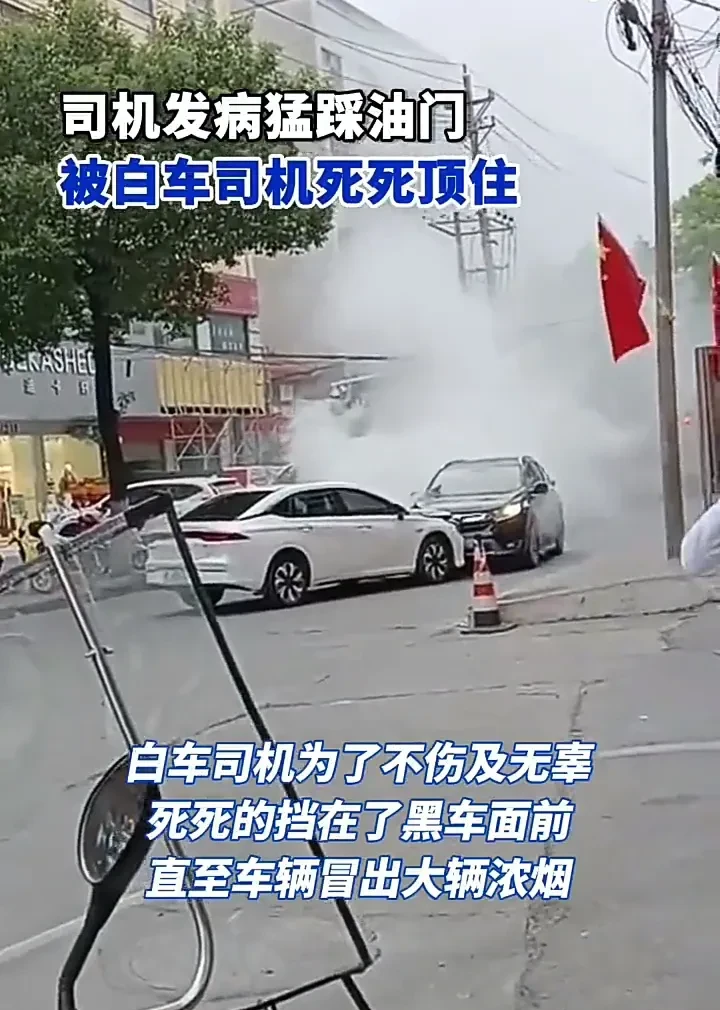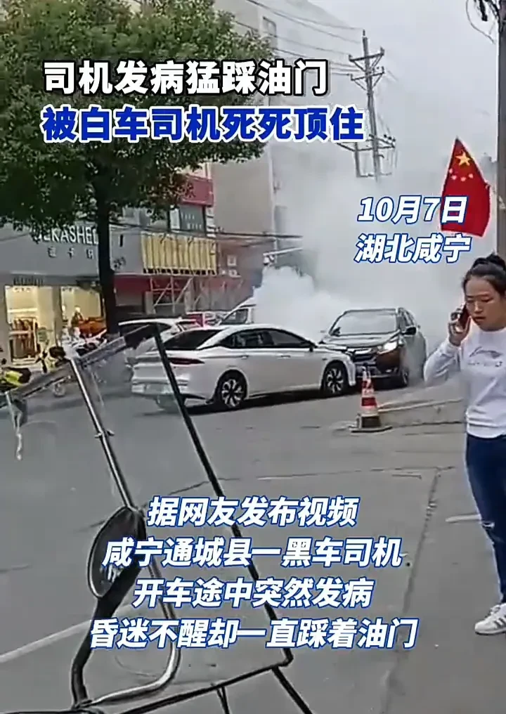 10月7日,湖北咸宁通城县一条街道上,一位黑车司机在开车时突然发病,昏迷不醒却一直踩着油门,这时一名白车司机见状,为了不伤及无辜,便死死顶在黑车前面,最后将黑车逼停救出司机。