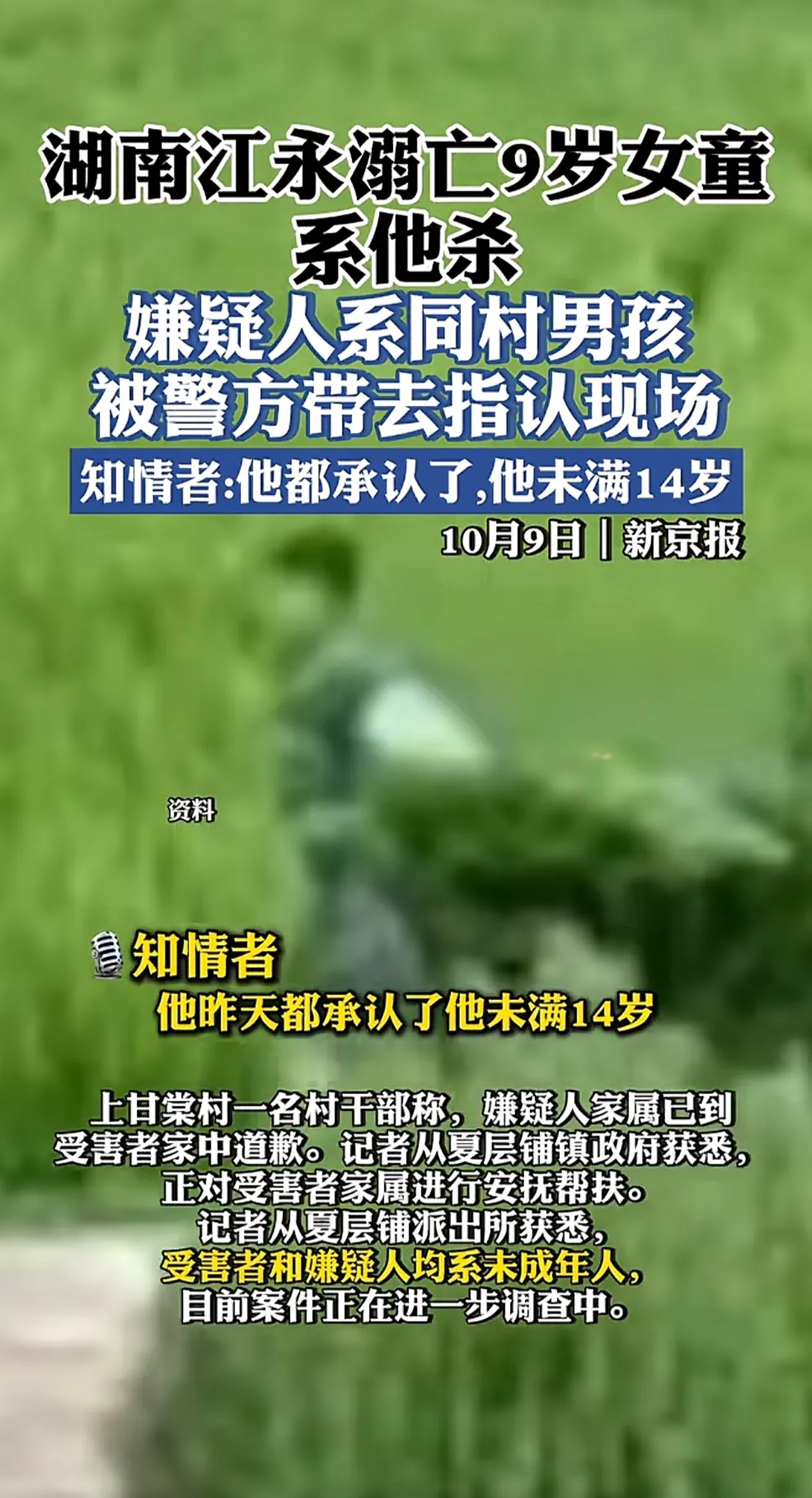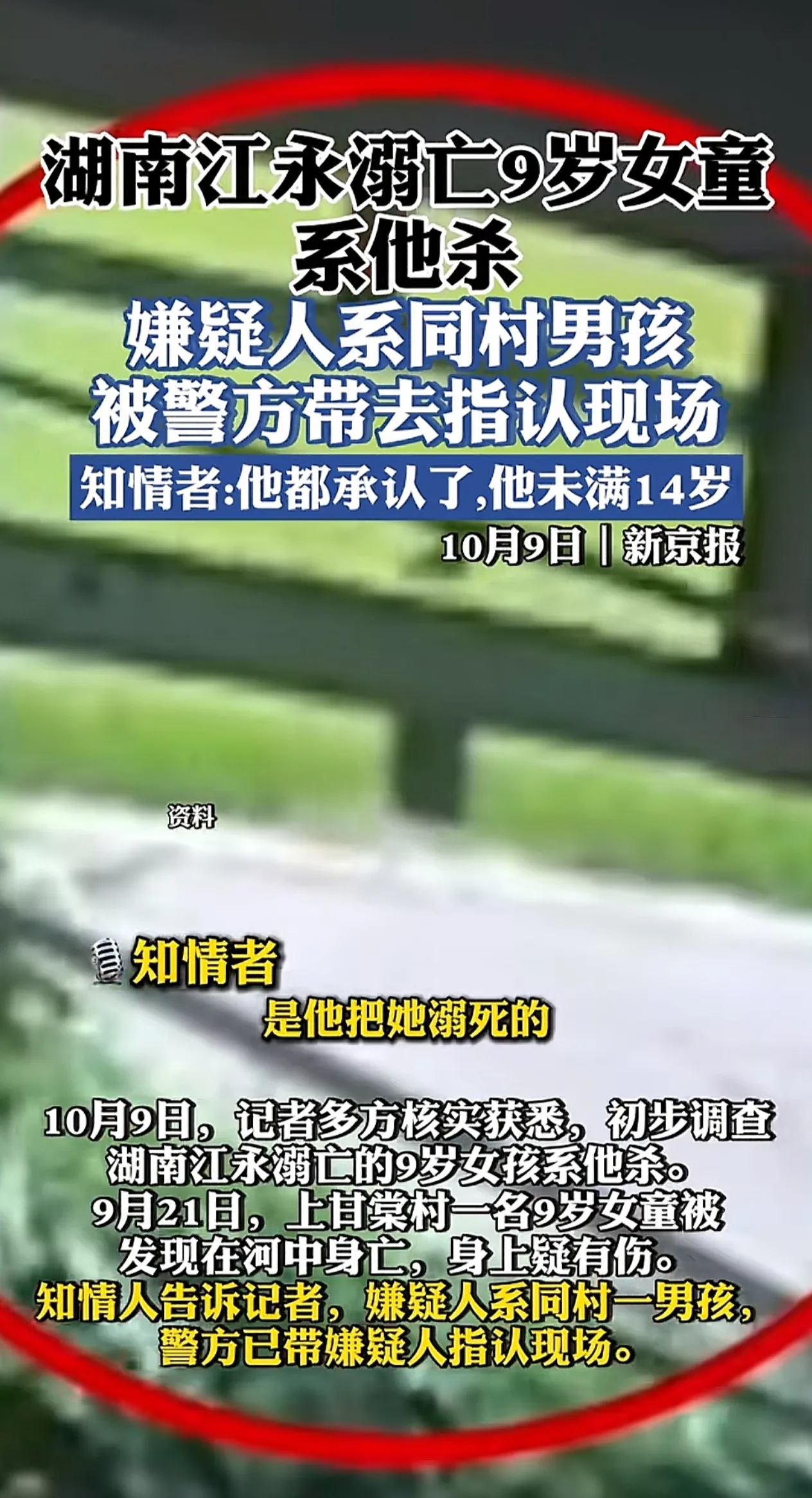 嫌疑人是同村男孩竟还未满14岁!10月9日经过多方核实,湖南永江9岁女童溺亡事件并非意外事故,而是他杀的刑事案件。9月21日那天下着小雨,上甘棠村一名9岁的女童,被村民发现在一处极为偏僻的河中身亡,身上有多处伤痕,经过警方多天的努力侦查,嫌疑人系同村的一名男孩。