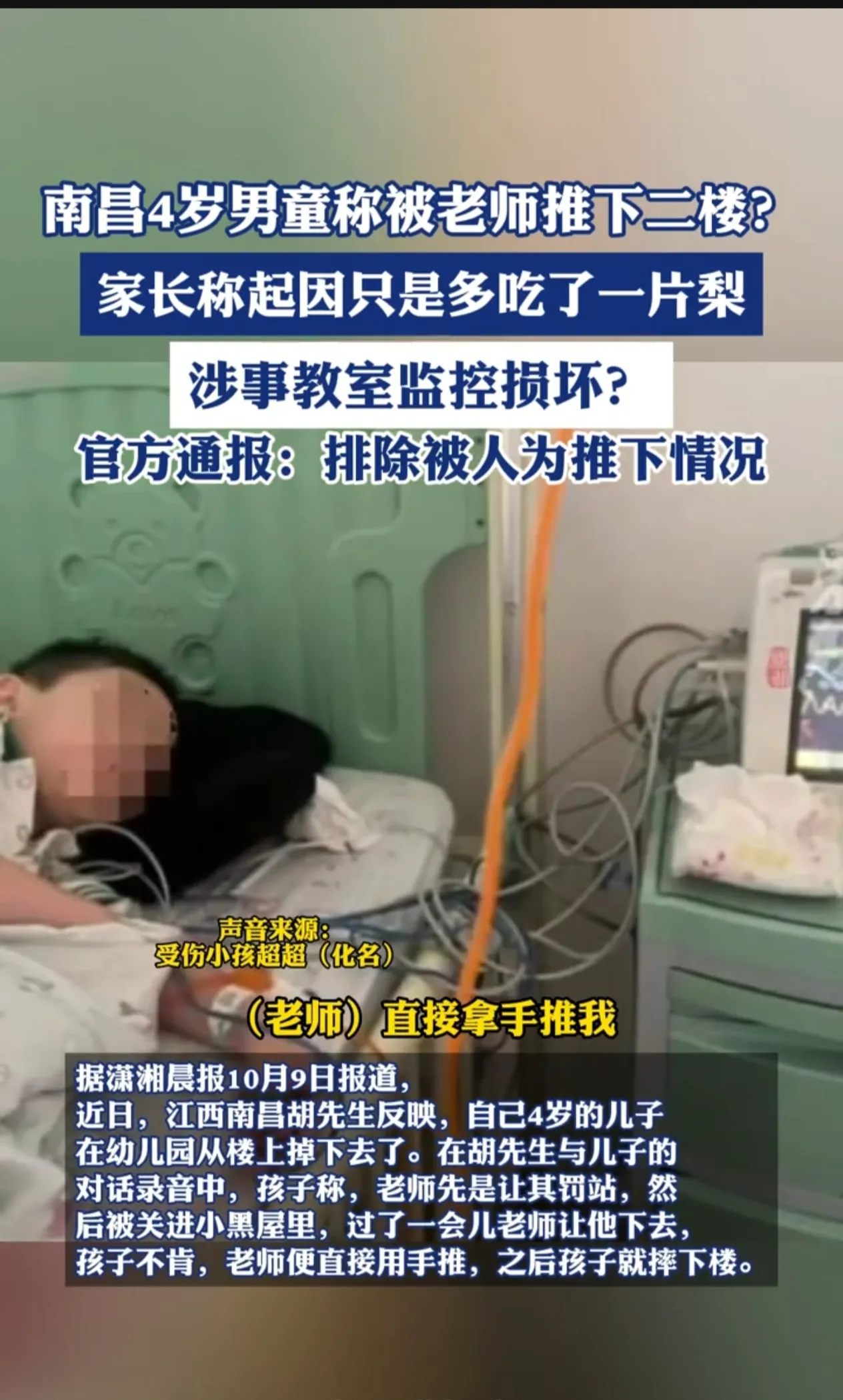 起因只是多吃了一片梨!10月9日来自江西南昌4岁男童的父亲胡先生反映,自己4岁的儿子在幼儿园上学期间,从二楼掉下去了,胡先生和儿子通话录音中,孩子说他多吃了一片梨,老师让他罚站,又将他关进小黑屋,过了一会后老师让他下楼,他不肯下去,老师就直接用手推他,之后就摔下了楼,事情发生于9月30日的上午10点左右。