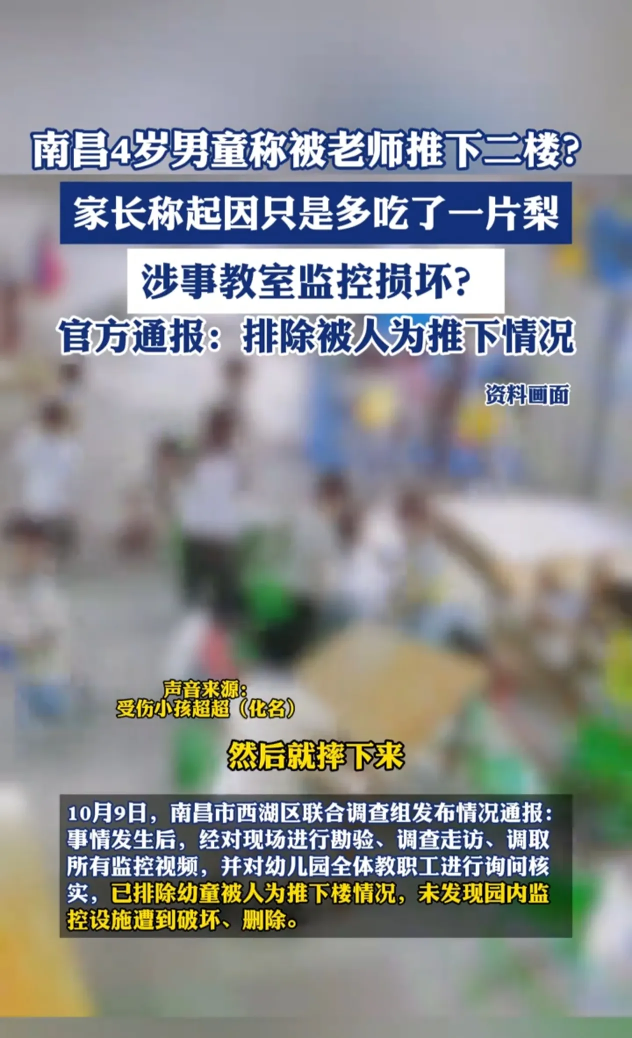 男童摔下楼被紧急送医治疗,事故发生后南昌市有关部门高度重视,迅速成立调查组展开调查,10月9日南昌市西湖区联合调查组发布了情况通报,经过调查,2024年9月30日上午10点03分,西湖区皇冠宝贝幼儿园幼童胡某独自跑进,与自己本班相近的二楼空置的无人教室,10点15分48秒男童从空置的教室窗户位置跌落至一楼,经过现场进行勘验,调查走访,调取幼儿园所有的监控视频,并对全校老师职工进行询问核实后,已经男童被人为推下楼的情况,也没有发现监控被破坏视频被删除。