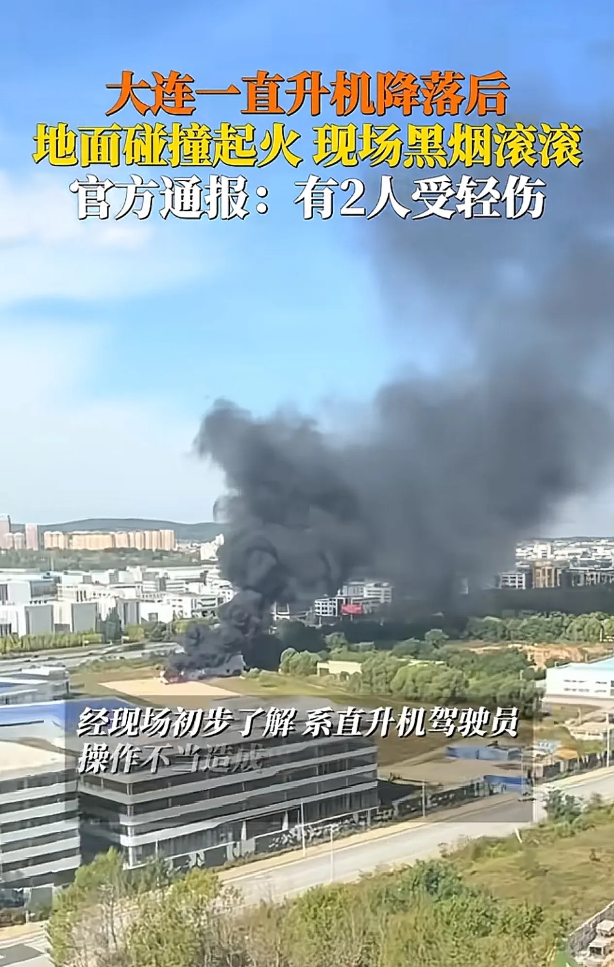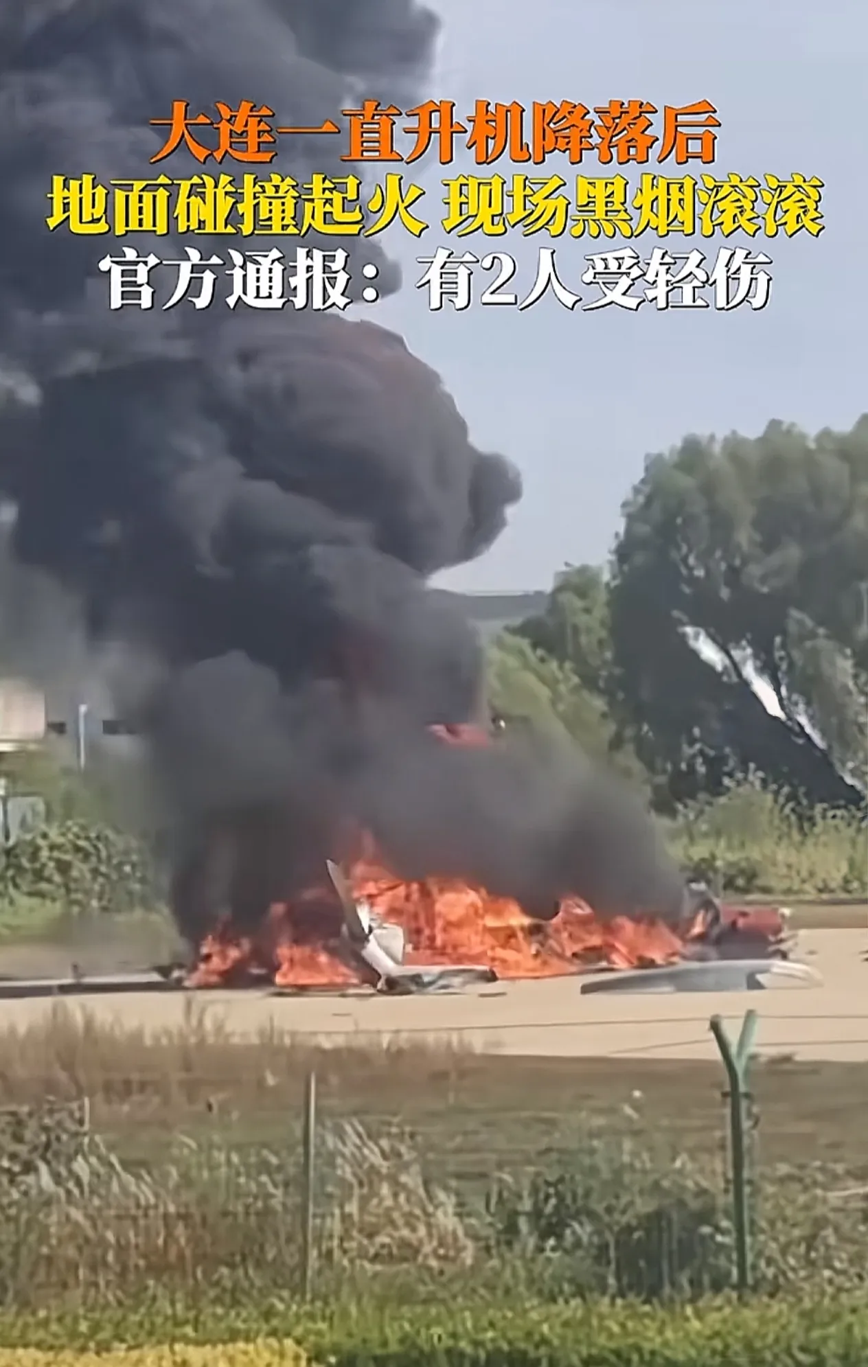 浓烟滚滚有2人受伤!10月9日有一架,执行季节性航空护林任务的直升飞机,在大连金普新区区域航空护林站降落后,在地面行驶过程中,飞机的后部旋转叶片,不慎与地面发生碰撞,瞬间燃起火焰,引发火情导致飞机损毁。
