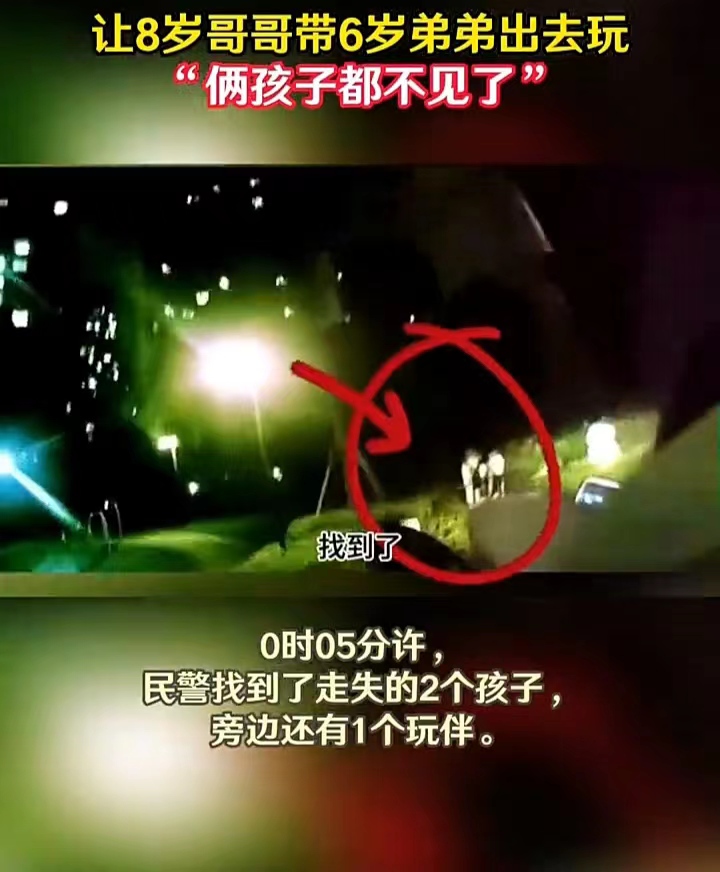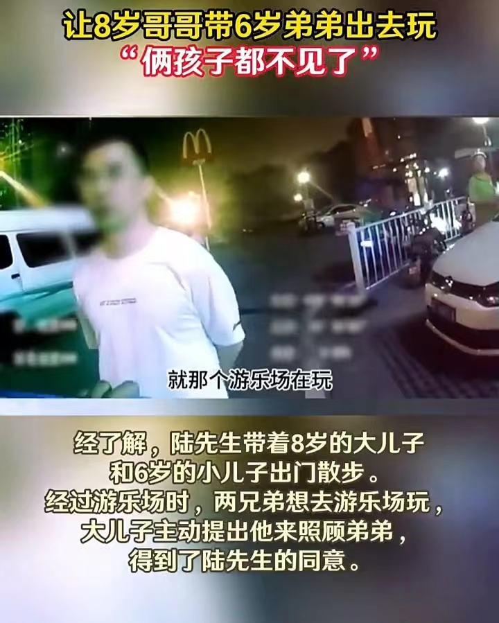 近日,江苏苏州一名男子晚饭后带两个孩子到游乐场玩,期间由于他想要跑步,便让8岁的哥哥带着6岁的弟弟,谁料等他回来,却发现两个孩子都不见了,无奈之下他只好报警,所幸在民警的搜寻下,很快将两个孩子找回。
