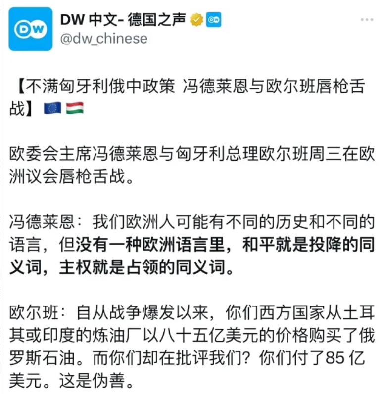 无情披露!欧盟内部乱套了! 匈牙利总理披露说,俄乌战争以来,西方国家从土耳其或印度的炼油厂用85亿美元购买俄罗斯石油。而现在却伪善的批评我们。 事实上,匈牙利总理欧尔班这次在欧洲会议上火力全开,丝毫没有给欧盟委员会主席冯德莱恩以面子。而冯德莱恩也是气的够呛。 只是欧尔班披露的是真实的消息,欧盟也是被揭掉了遮羞布,这让他们恼羞成怒。 不过事实如此,整个战争期间,印度进口俄罗斯原油提炼后卖出,赚的盆满钵满,这也是不得不承认的现实。 而也有消息爆出,匈牙利总理欧尔班正面临被刺杀的现实。