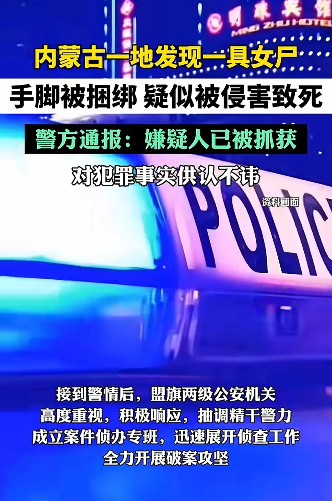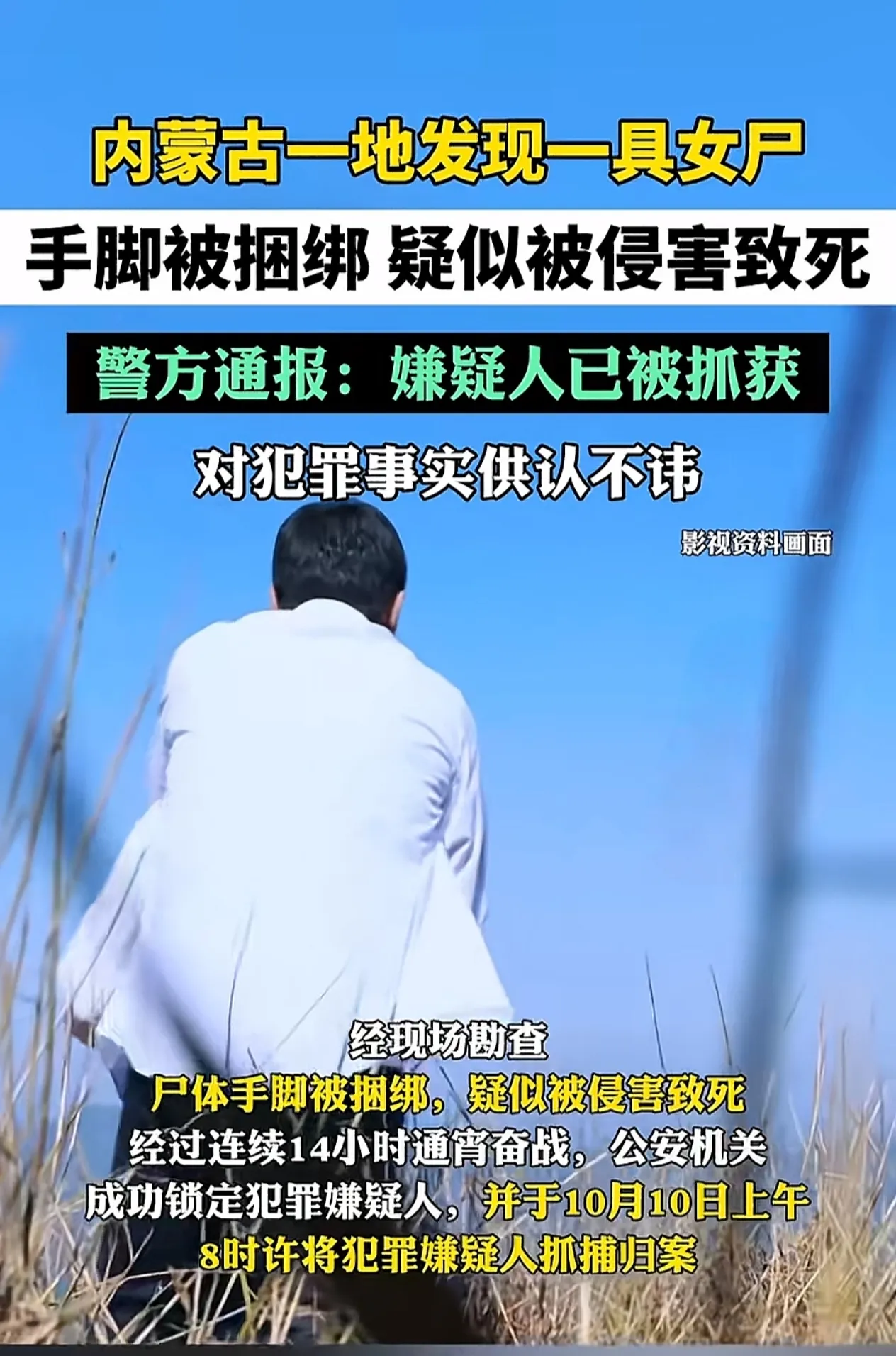 发现一具手脚被捆绑的女尸!平安左旗发布重要通报,在2024年10月9日晚上6点11分左右,阿左旗公安局刑侦大队,接到一起报警电话,有群众称他出门办事时,在辖区内一处地点,发现一具手脚被绳子捆绑的女性尸体。
