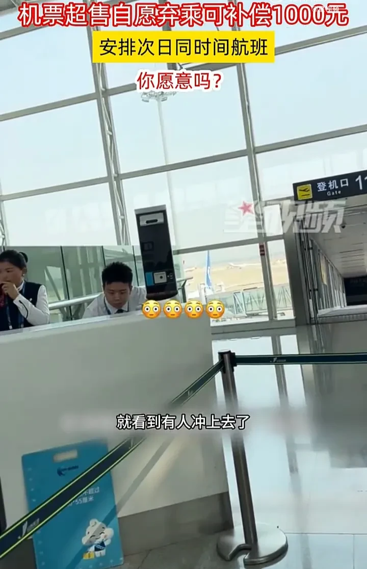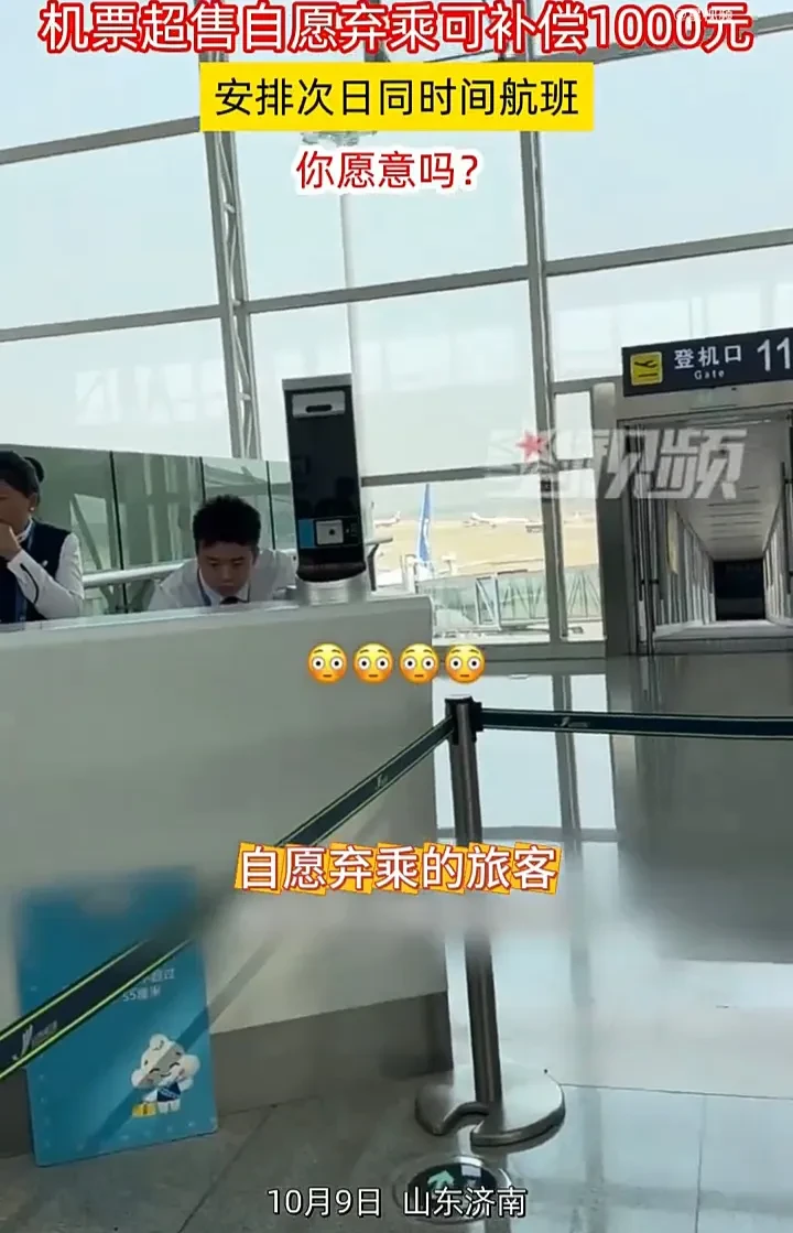 10月9日,山东济南一名女子发视频称,一机场内由于机票超售,工作人员便询问有谁自愿弃乘,可以补偿1000元,就在自己犹豫之时,已经有人抢先冲上前,表示愿意弃乘。