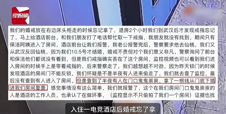 10月7日,湖北仙桃一名女子发视频称,自己和丈夫刚结完婚,入住一家电竞酒店时遗失了婚戒,于是调监控寻找,不料却发现半夜有酒店员工在门口偷窥。对此酒店方回应,员工有精神疾病,是他个人行为。