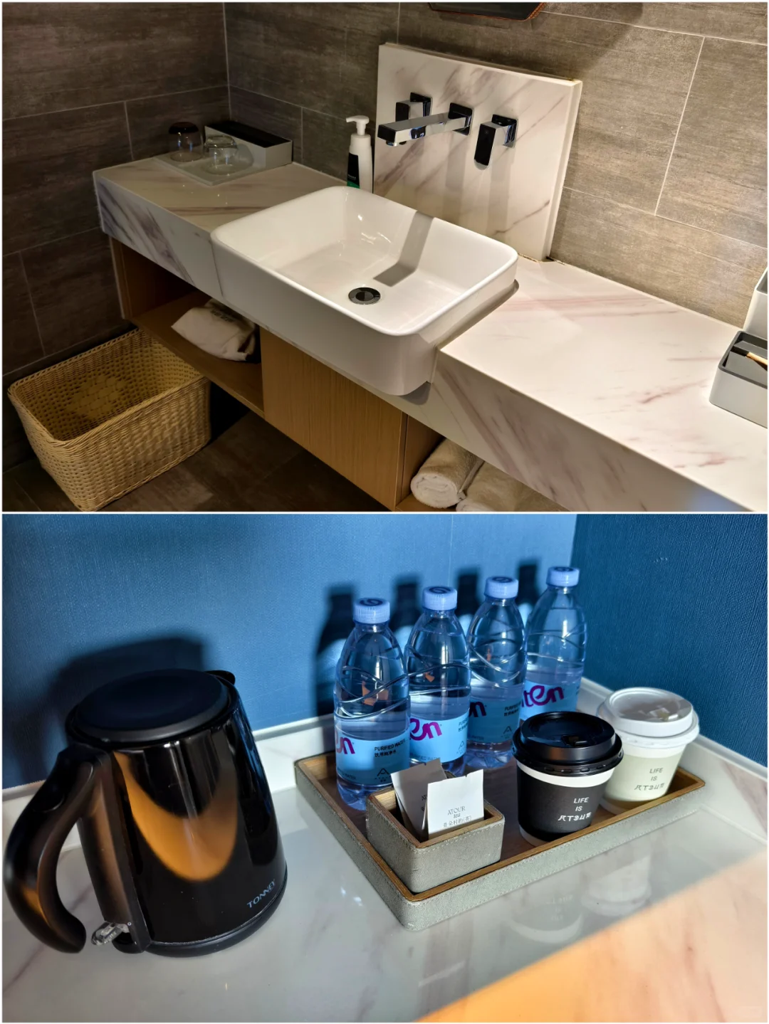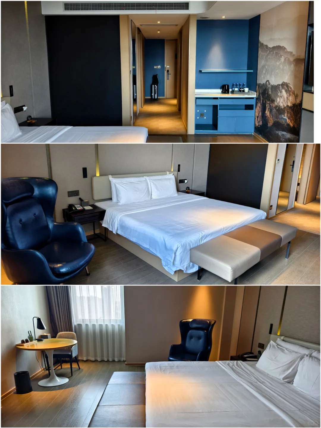 客房安排在了高区,房间还是挺整洁干净的,南边能看到江阴体育中心、江阴万怡酒店等,北边能远眺芙蓉湖公园、江阴长江大桥和长江等等,房间提供了茶具和茶叶,还有香薰,没有咖啡胶囊机。(P6~P11)。