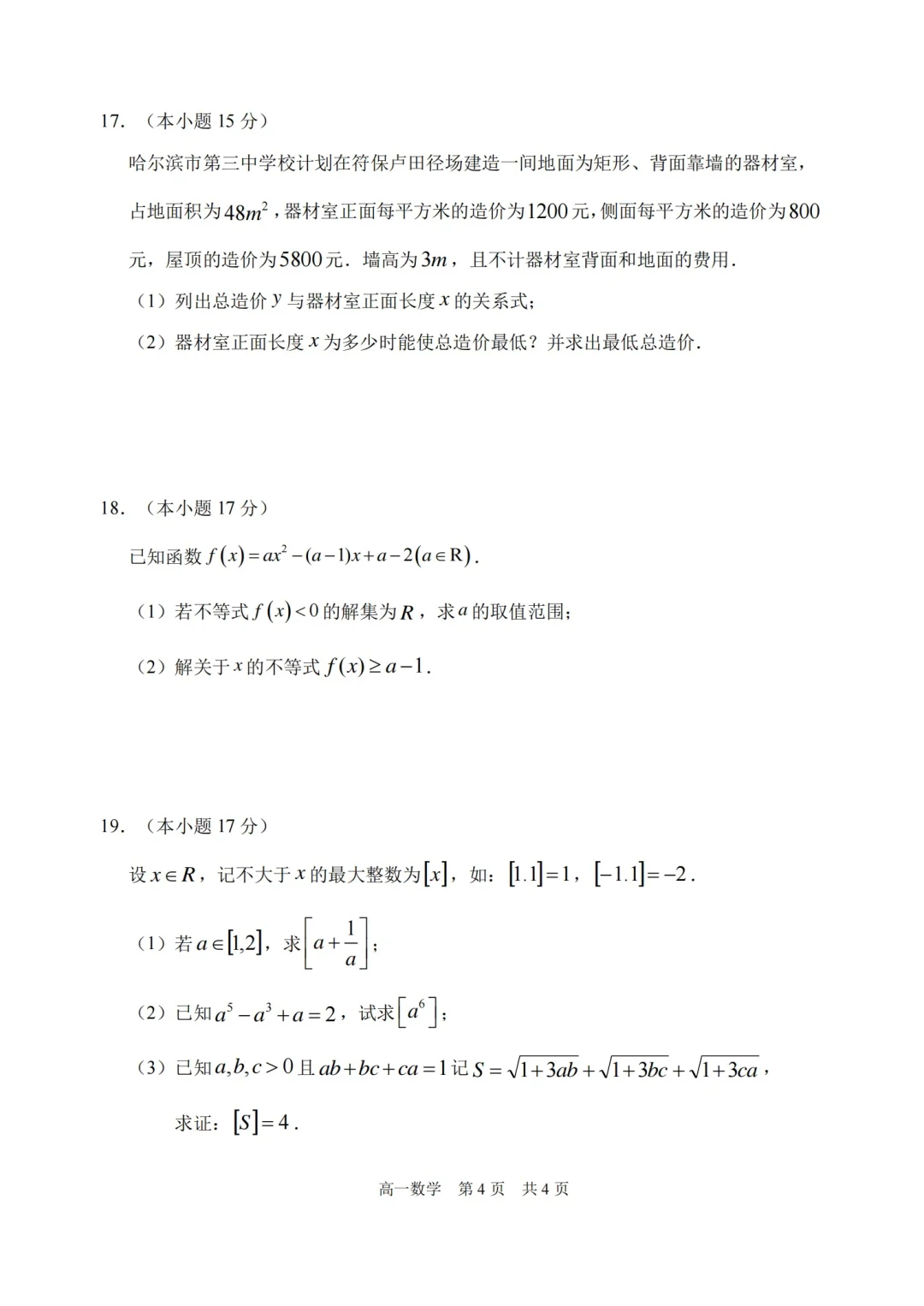 哈三中高一月考试题