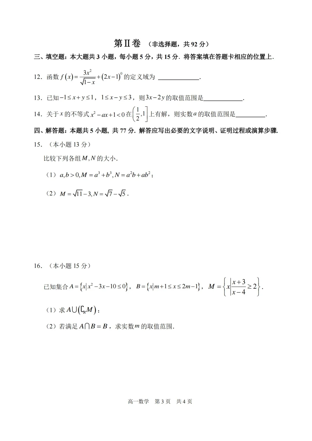 学生考蒙了!2024烟台高一期中考试试卷